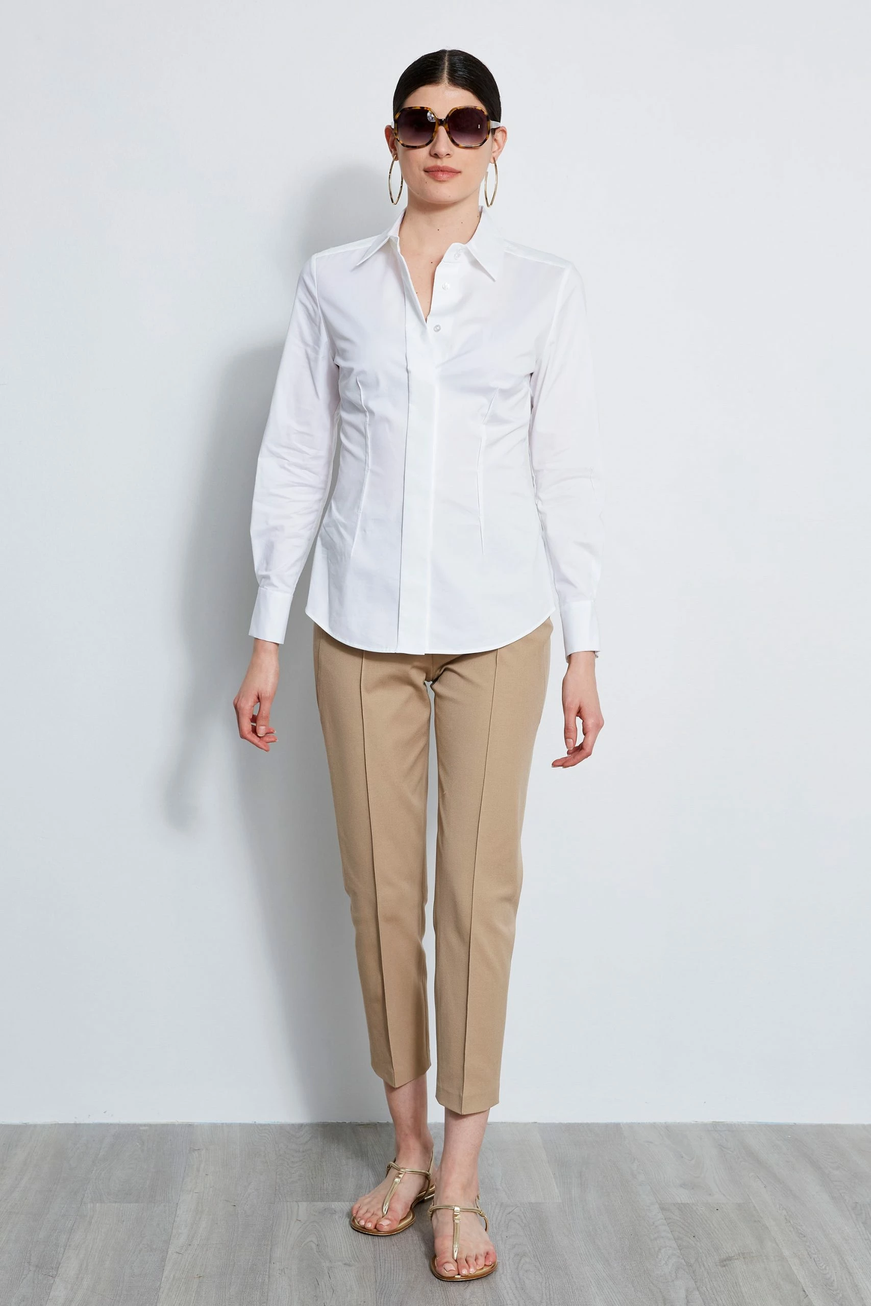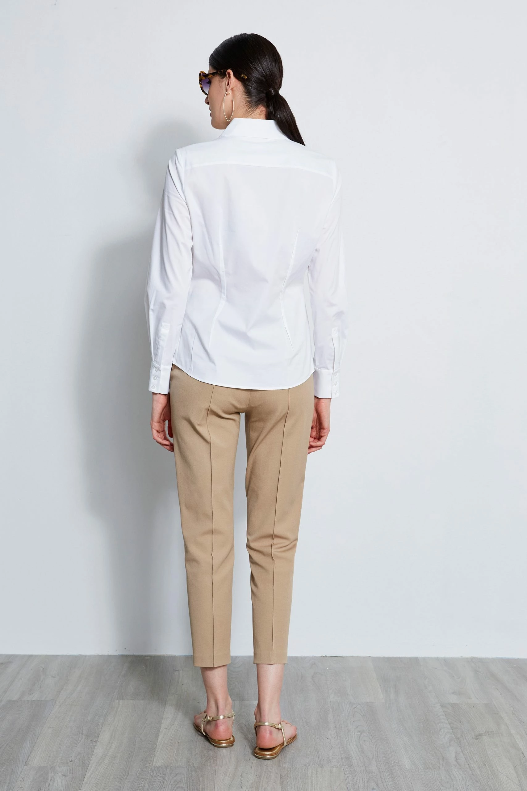 Designed in our favorite luxe Stretch Cotton, this Fitted Shirt isn’t your basic Cotton Poplin button down. Exposed dart details lend a decidedly femme twist to the season’s essential white shirt.Â