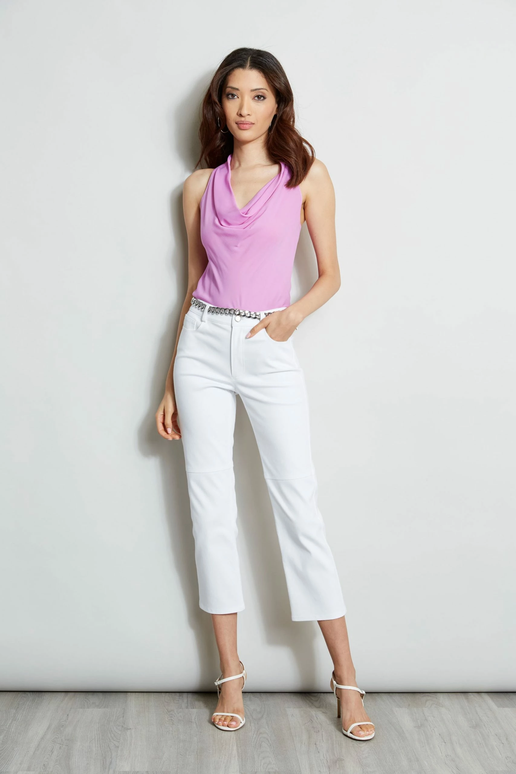 Elie chose Luxe Silk Georgette for his draped cowl neck Top. Wear it layered under our crepe Jacket or on its own for a modern femme vibe.