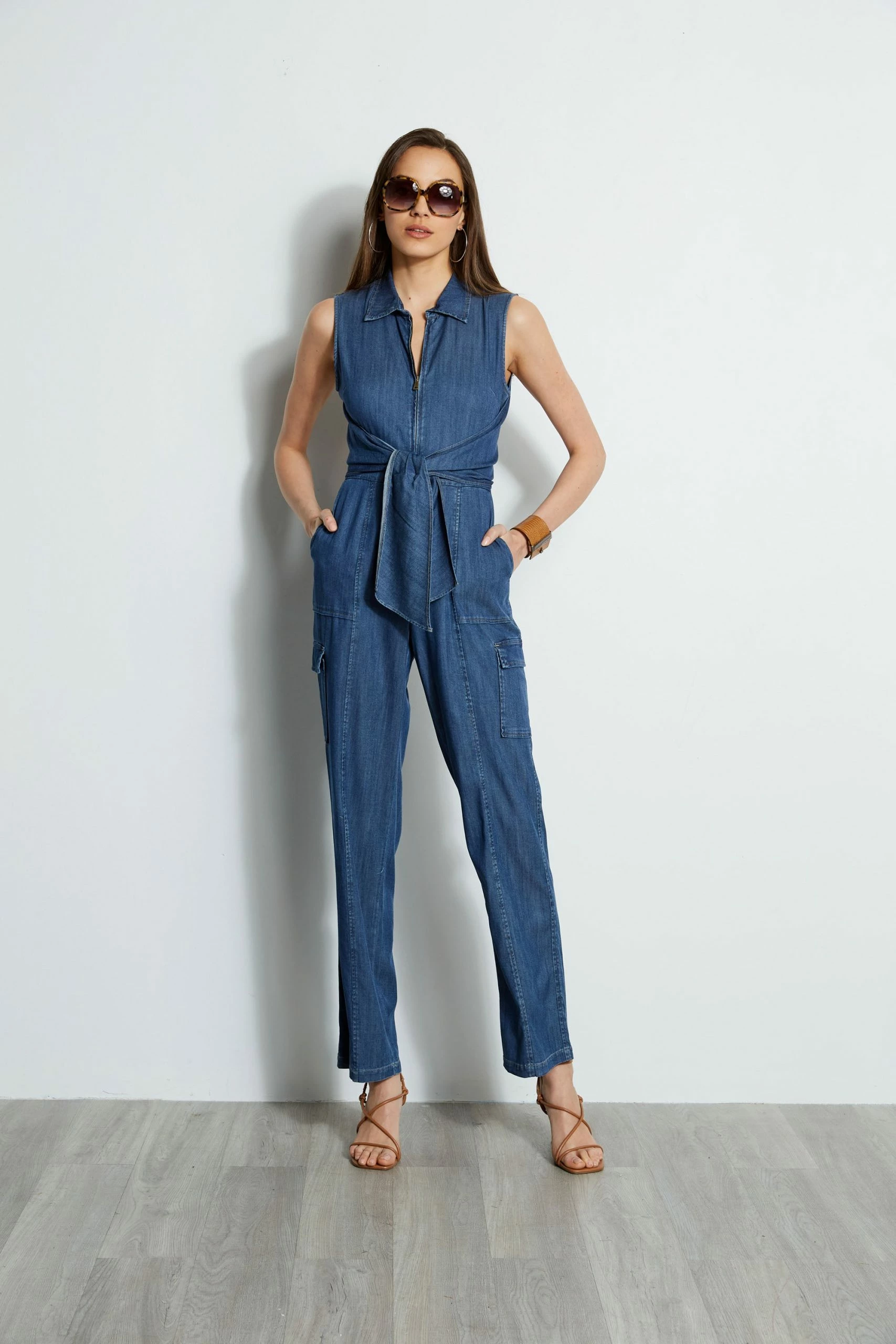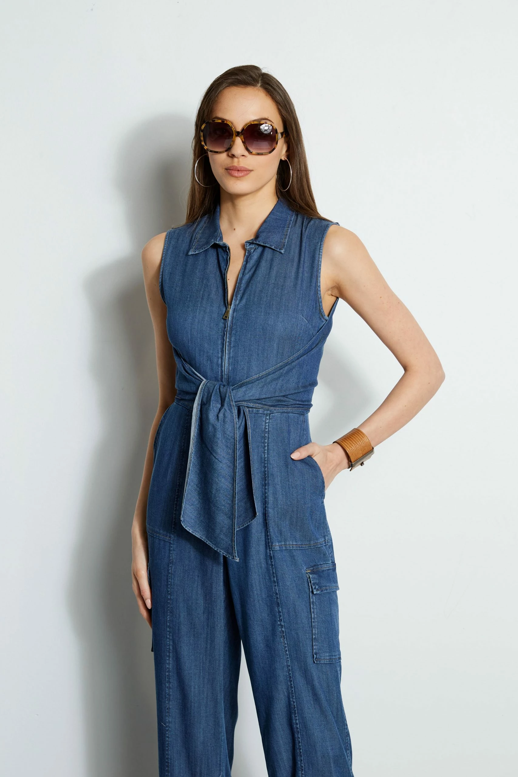 - Sleeveless Tie Front Stretch Denim Fabric Jumpsuit with Cargo Pockets & Zip Front Closure