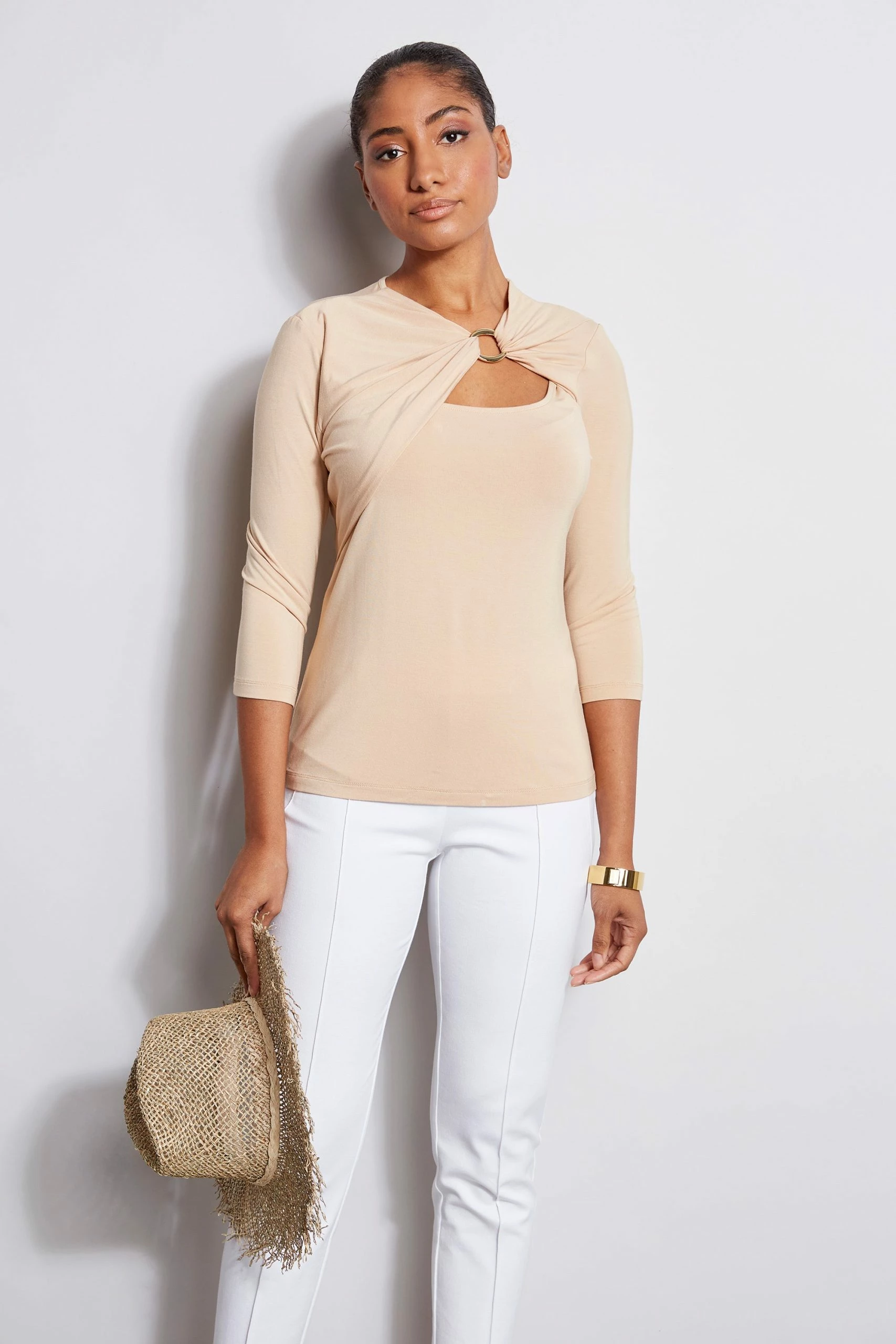 Done in Luxe Modal Jersey, a graphic metal ring & asymmetric keyhole detail adds a designer vibe to our ¾ sleeve knit. We’re obsessed with this Tee for day to dinner.Â