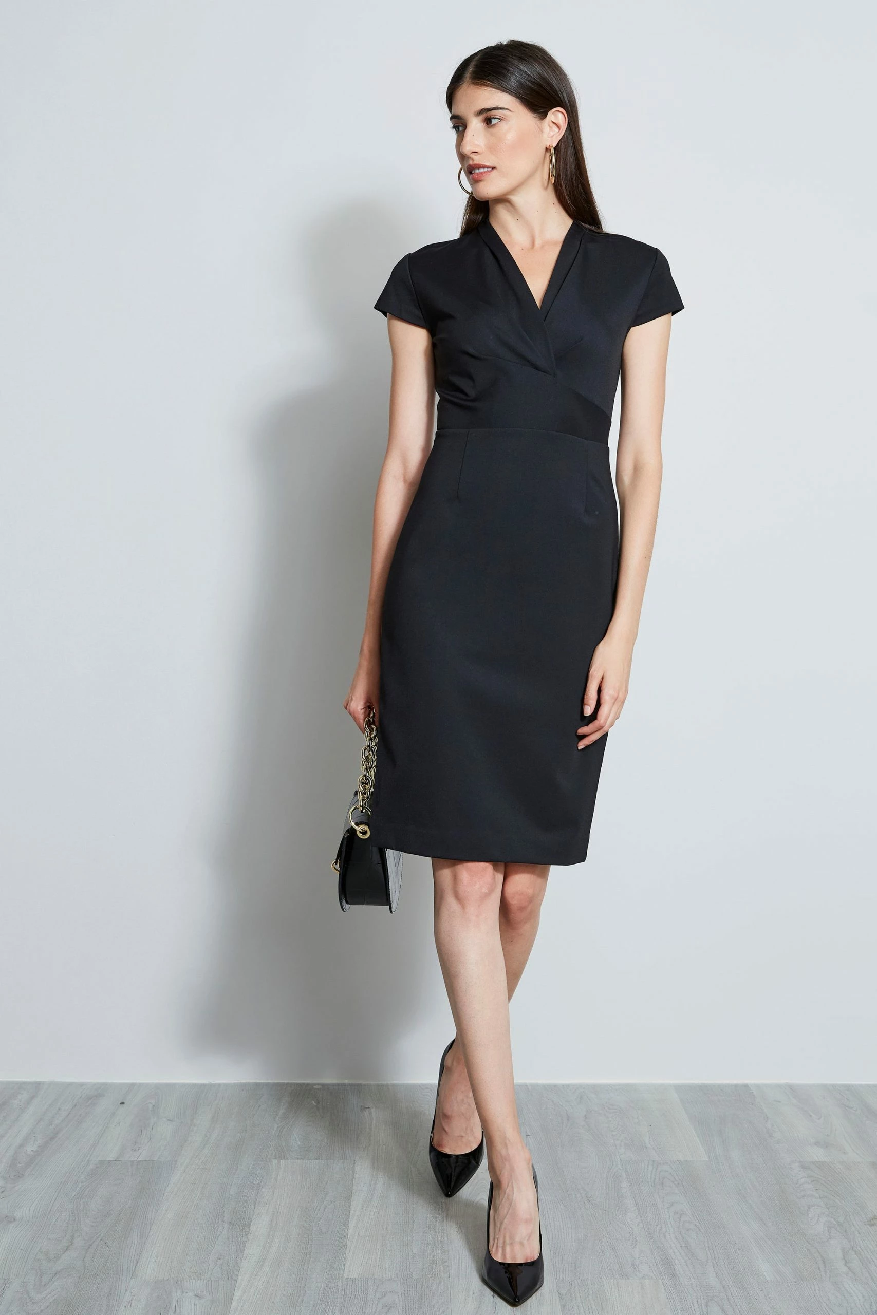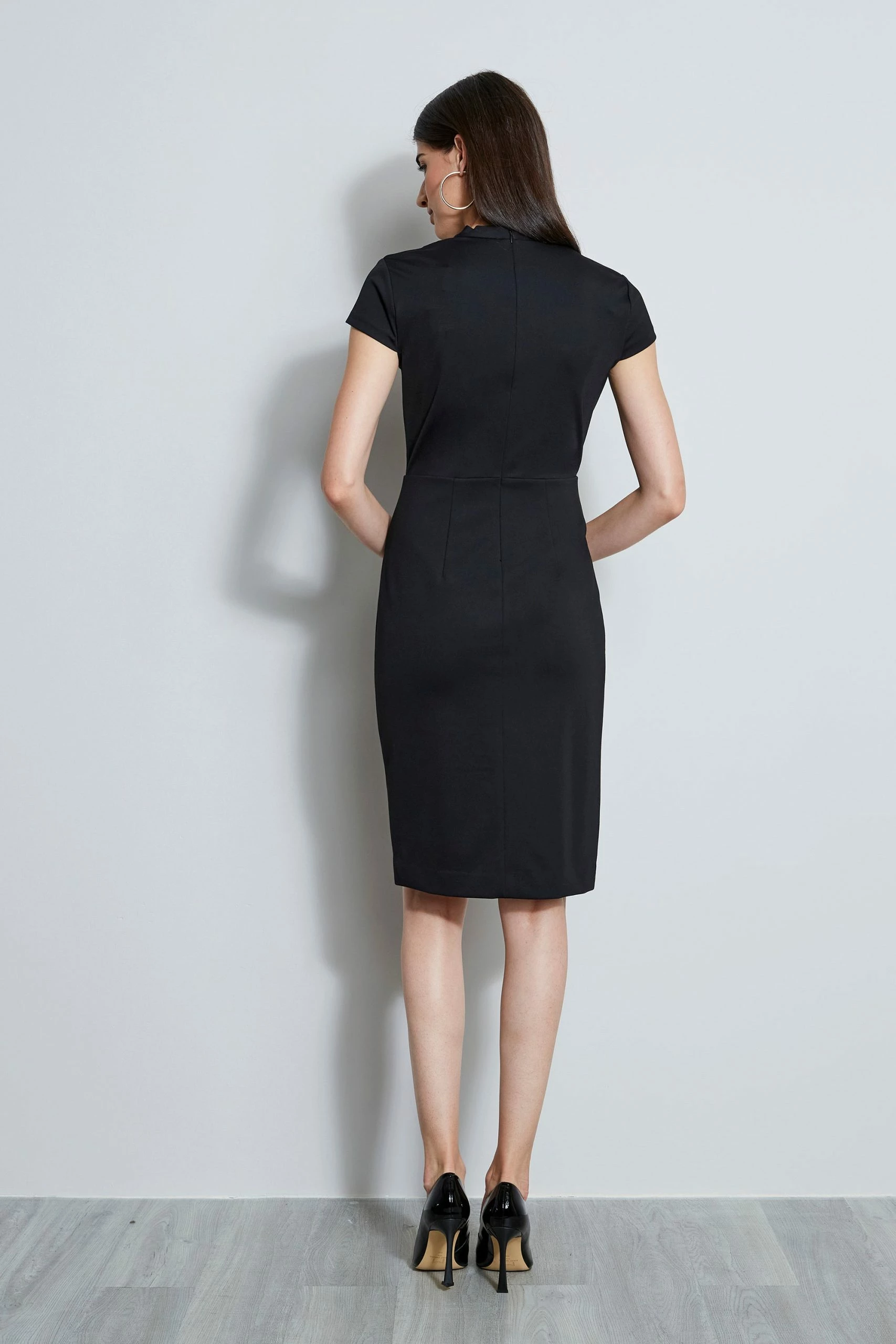 A directional silhouette in double knit, this modern column dress features a draped front neckline for a chic look that will take you from day to dinner.