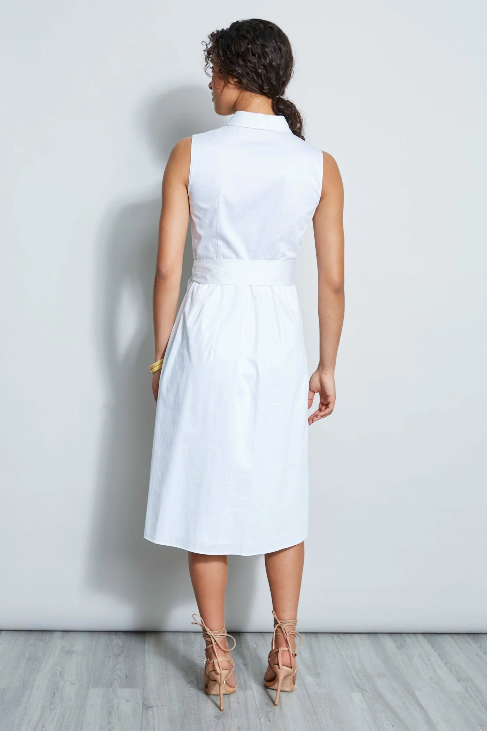 Our favorite stretch Cotton Poplin has the Luxe Patina we wanted for the season’s must have Shirt-Dress. The unique cut-out embroidery and easy pleat skirt give this dress its designer edge.