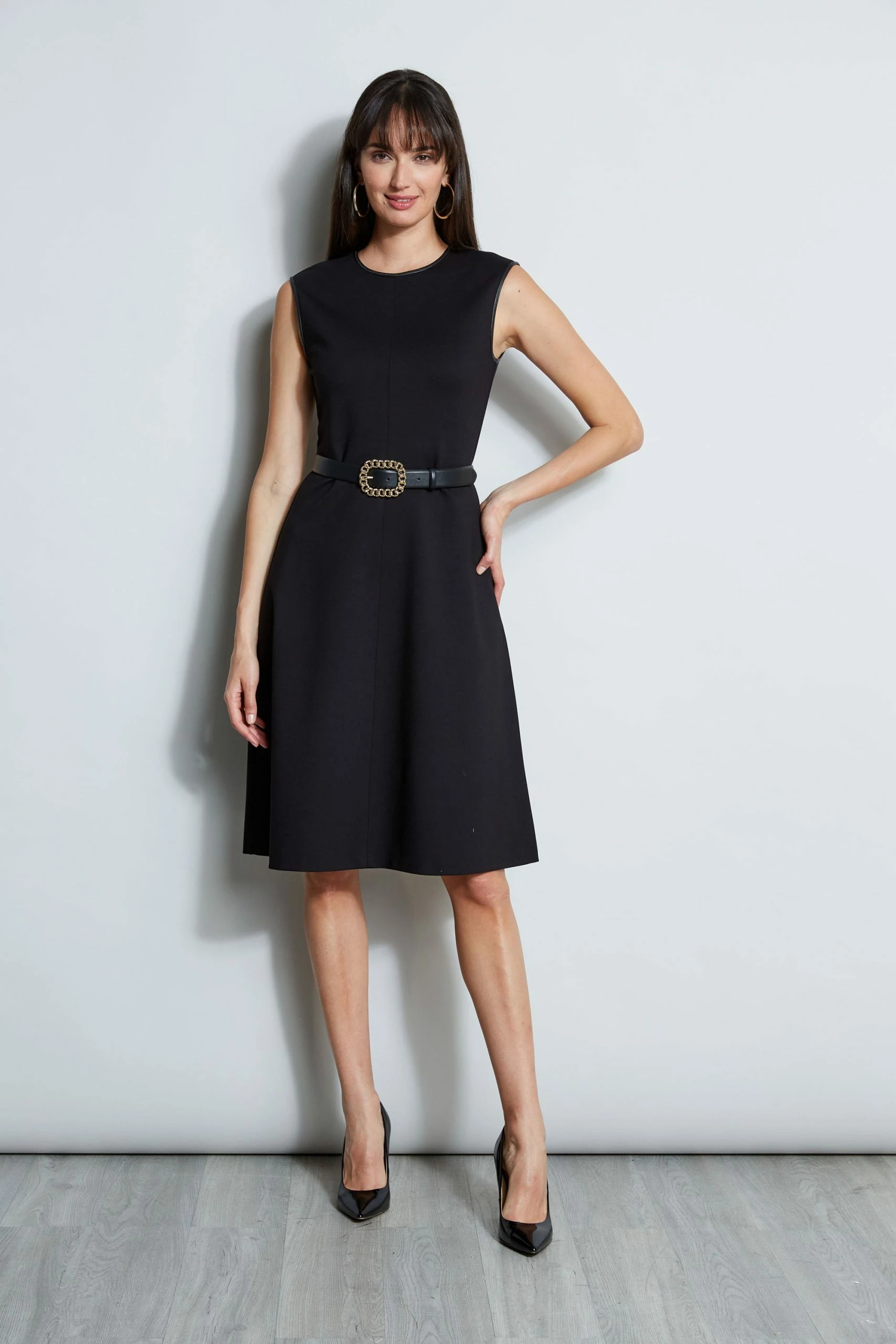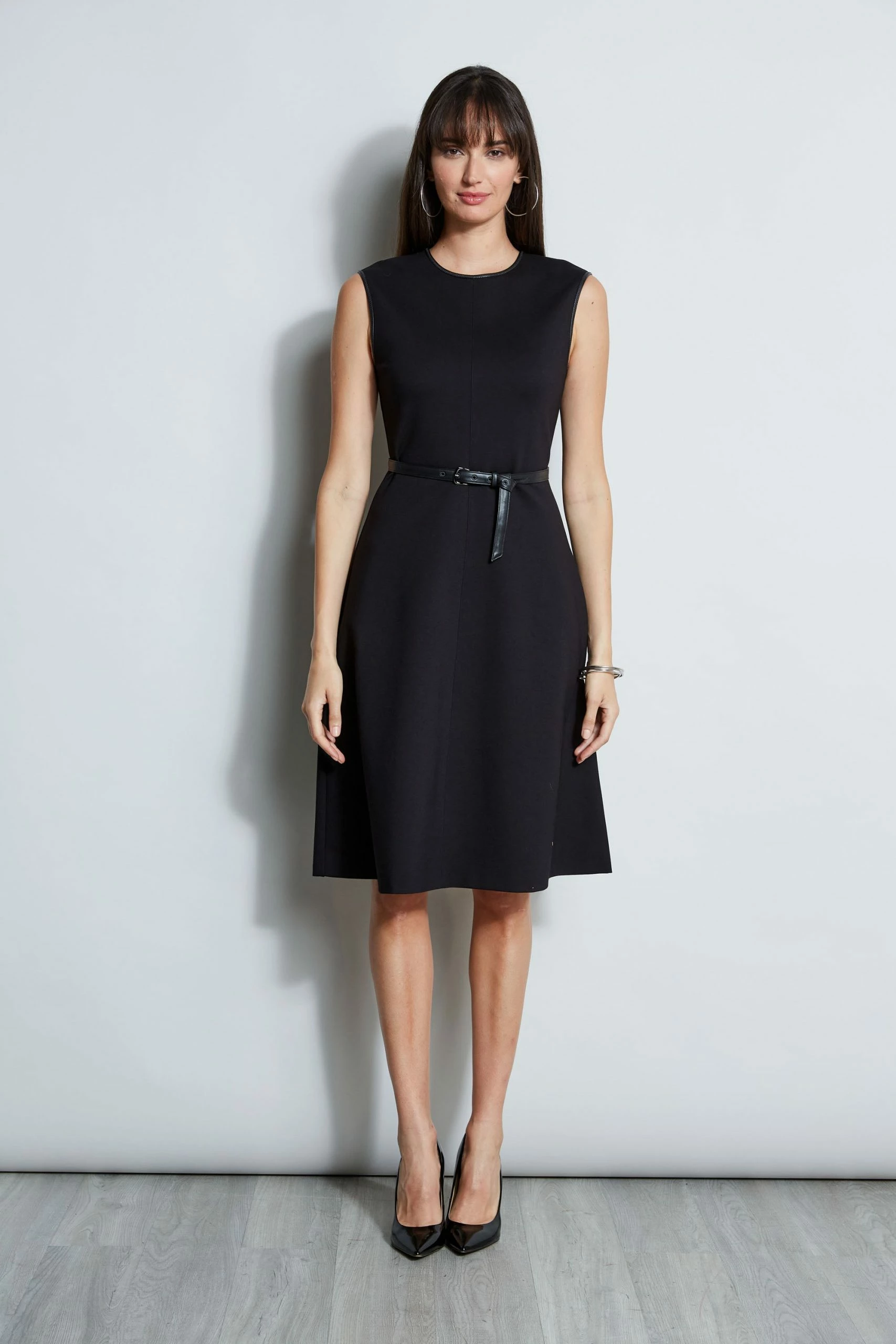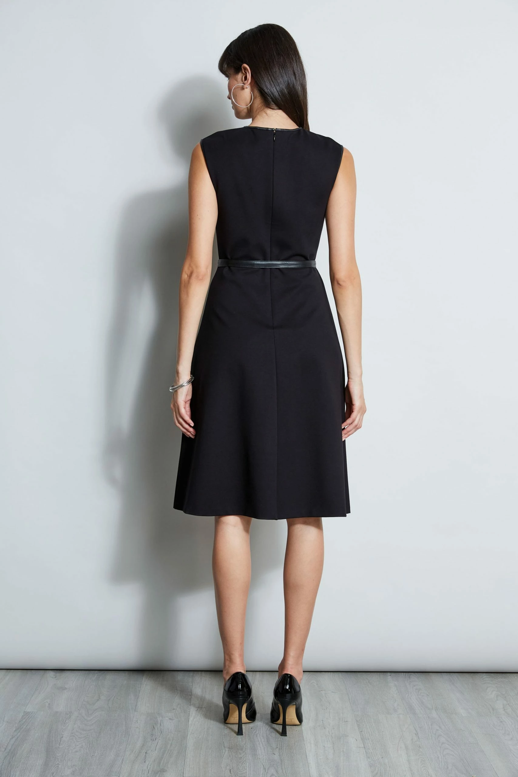 Our Stretch Ponte Double Knit Dress is a seasonless must have! The luxe vegan leather detailing and belt makes this fit & flare dress, perfect for day to dinner. For a chic dress & jacket look, pair it with Elie’s cropped Vegan Leather Jacket and Napa Leather Chain Buckle Belt.