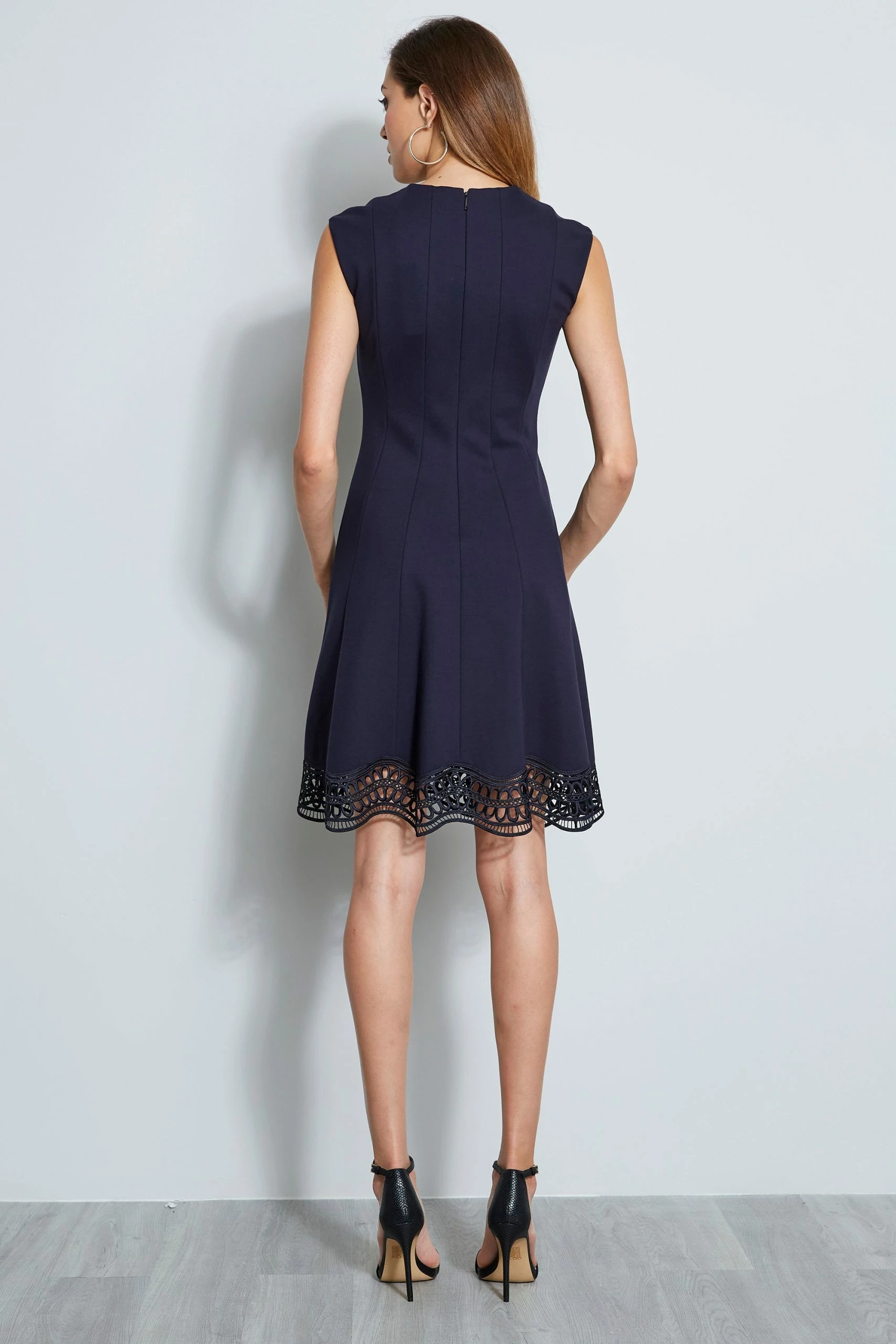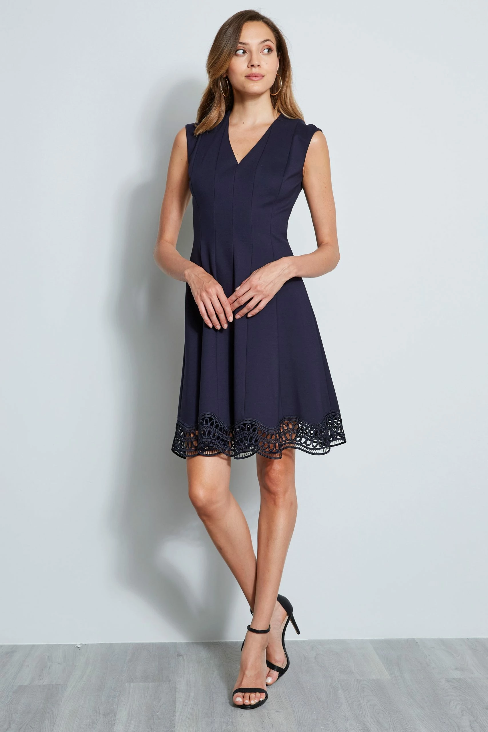 With its fitted body and flared skirt, this knit dress is elegant from its v-neckline down to its intricate lace hem.