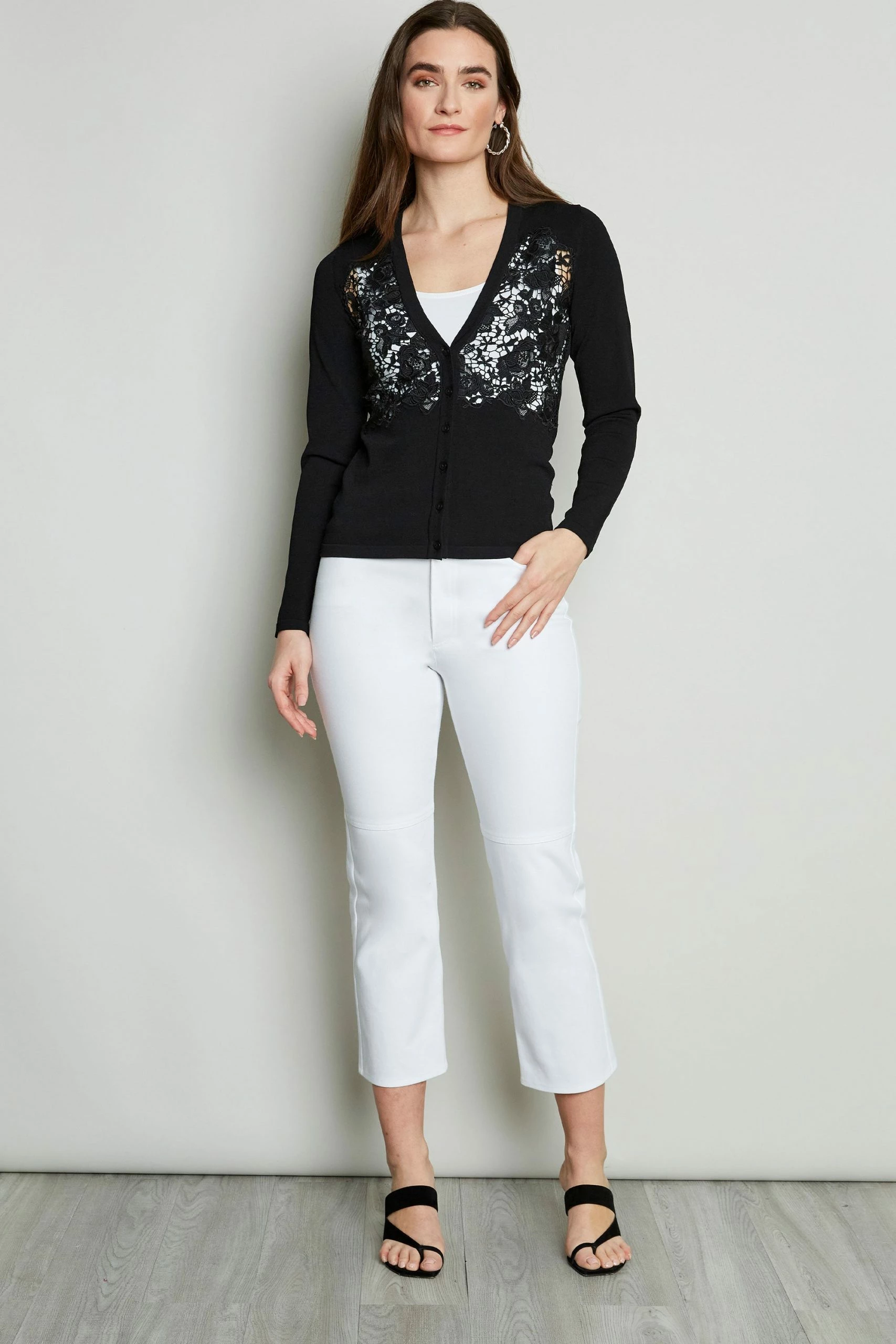 You will fall in love with this lace detailed body skimming cardigan. Designed in a Luxe Viscose blend, our V-neck cardigan has a romantic Lace applique insert and looks as good dressed down with denim or up.