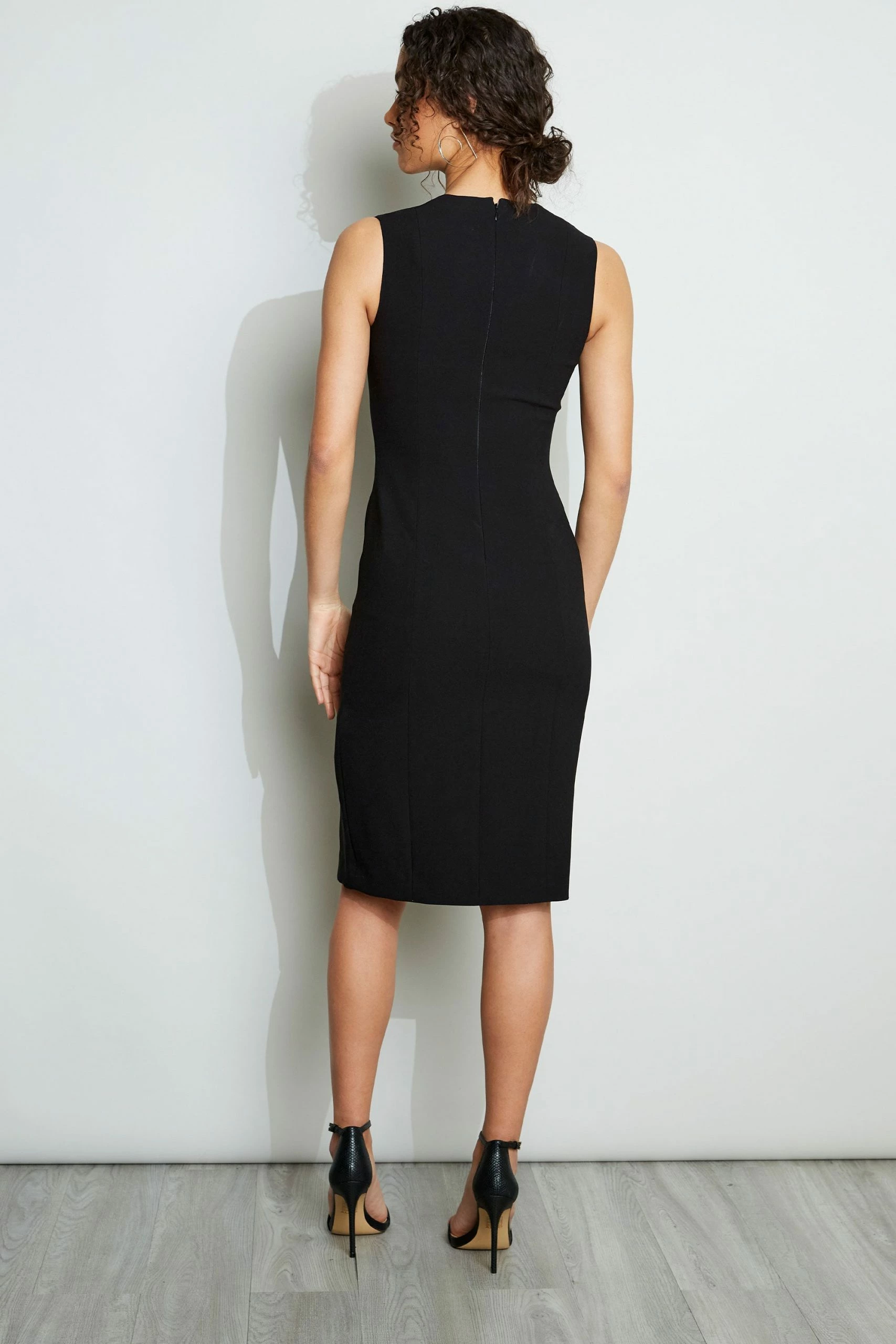 The body contouring lines of our sheath dress accent its modern slit & guipure lace detail. Designed in our signature Fluid Crepe, it flatters every curve.
