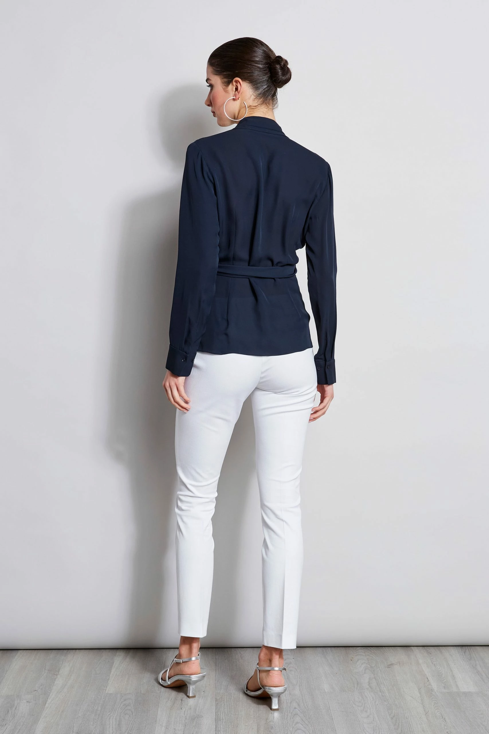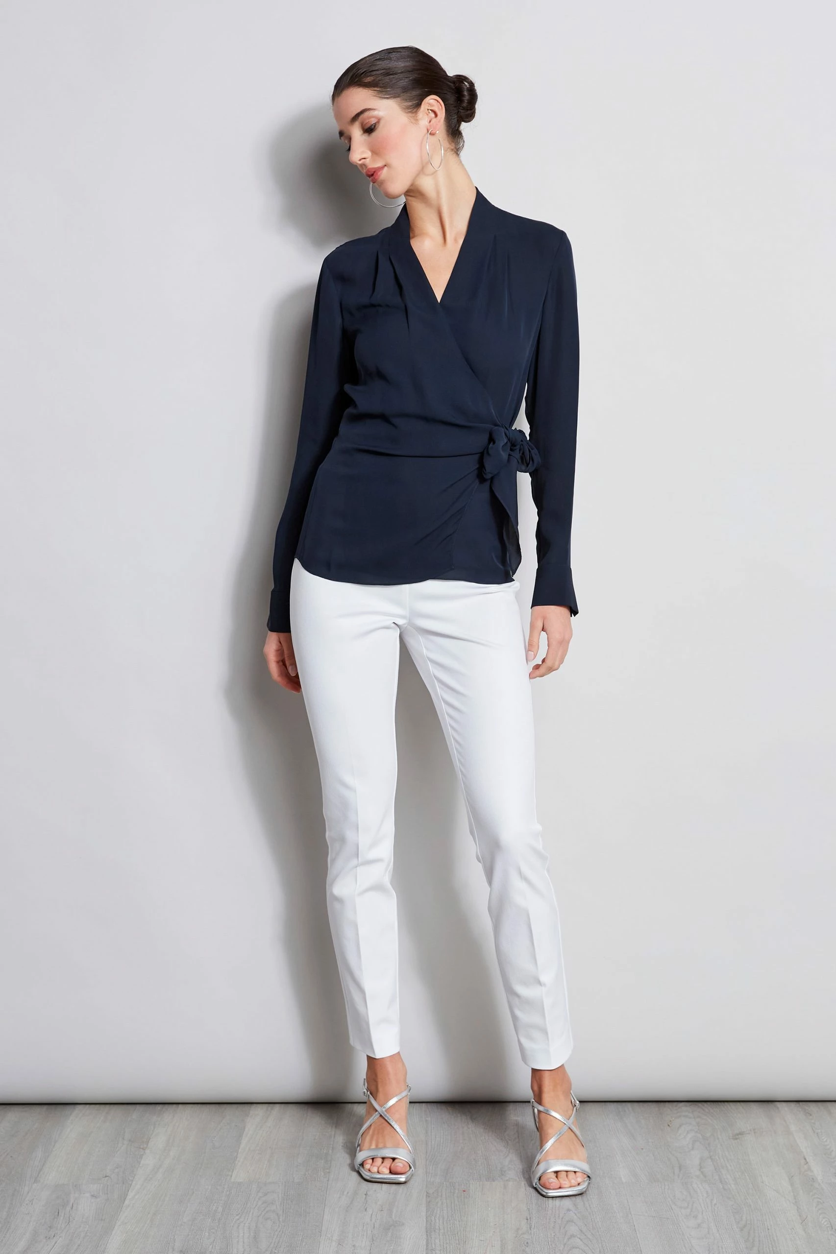 The Wrap Shirt takes a modern twist in Luxe Silk Georgette. The contour pleat detail neckline curves into the adjustable wrap tie. Perfect for Spring days, pair it with our Fluid Crepe Pants or Denim for a fresh look.Â