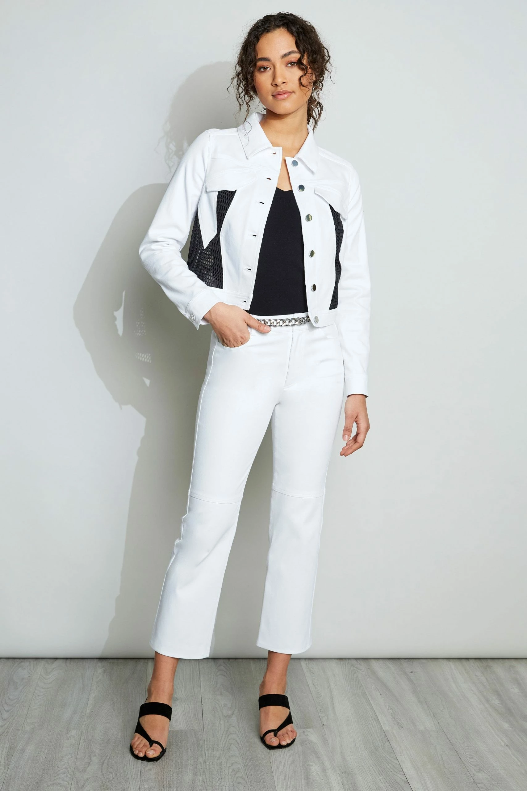 The unexpected mixed media of black mesh and white denim gives our jean jacket a modern edge. Wear it with its matching cropped jean or dress it up with our wide leg pant.