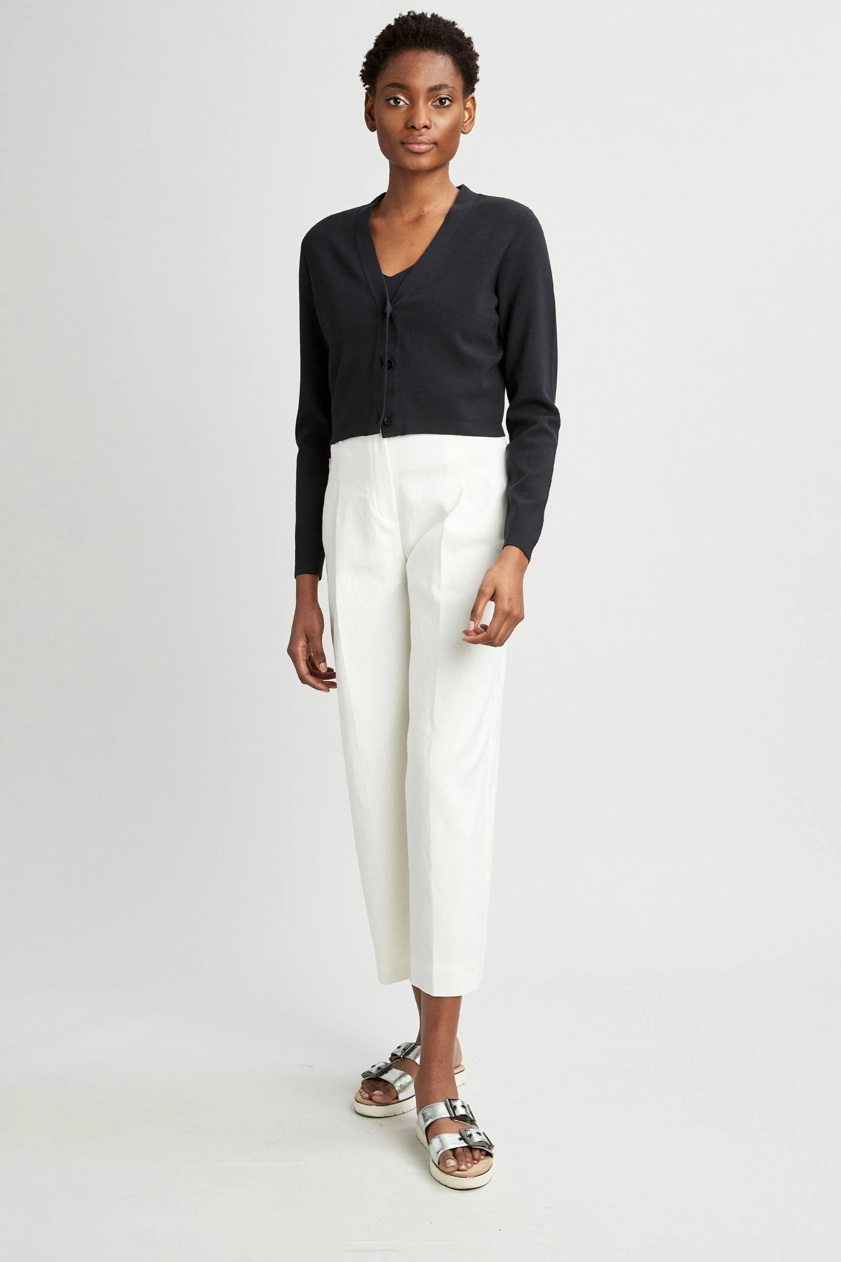 Designed to be your favorite cardigan, the Molly sweater has a deep V neck, three button closure and cropped body. It is modern, buttoned up on its own and paired with the Venus sweater. It’s a look that’s great for work or a cool evening out.