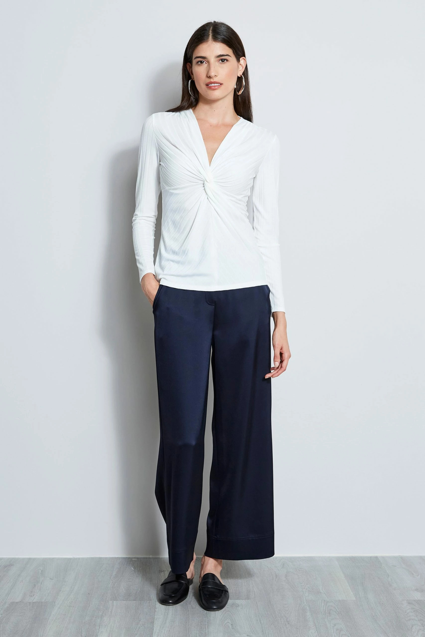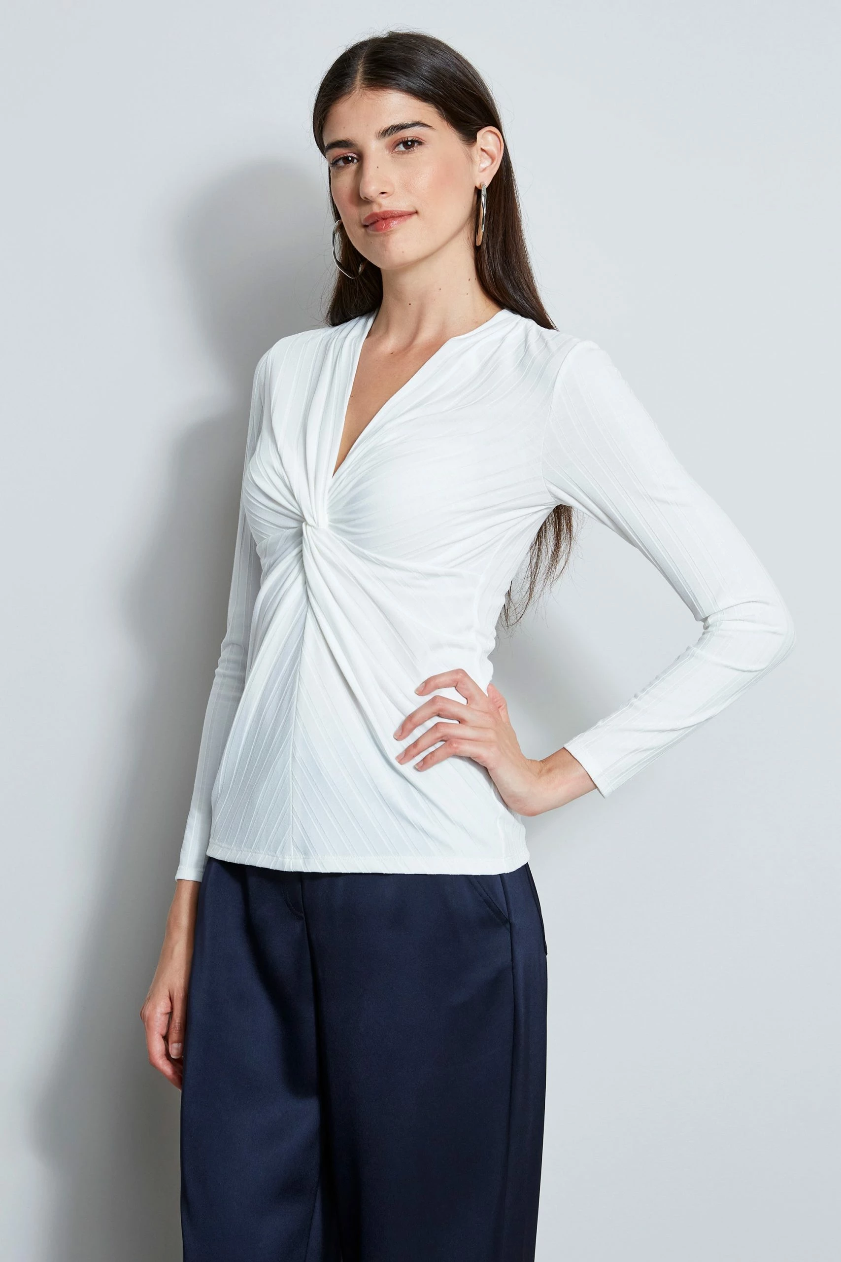 A fresh take on the long sleeve ribbed T-shirt. The twist front V-neck lends an artistic edge to this Luxe Ribbed Tee.