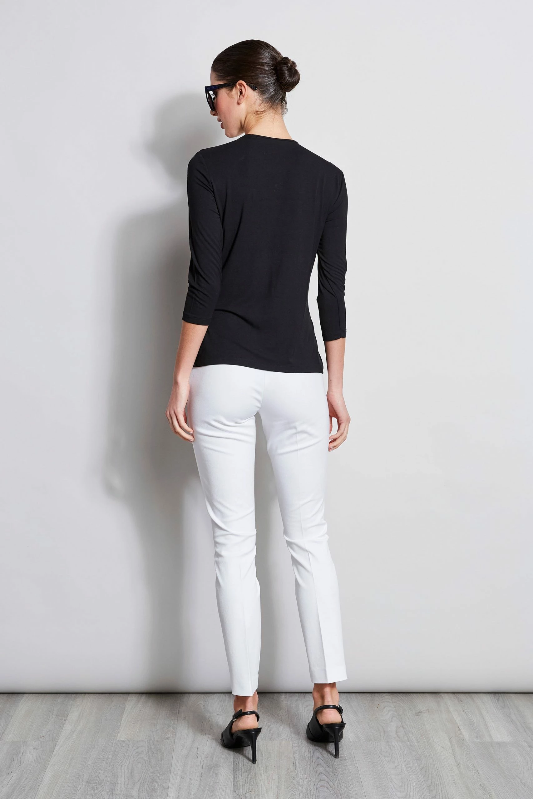 Done in Luxe Modal Jersey, a graphic metal ring & asymmetric keyhole detail adds a designer vibe to our ¾ sleeve knit. We’re obsessed with this Tee for day to dinner.Â