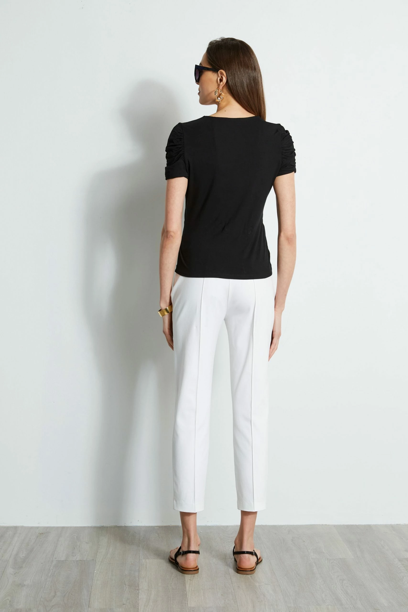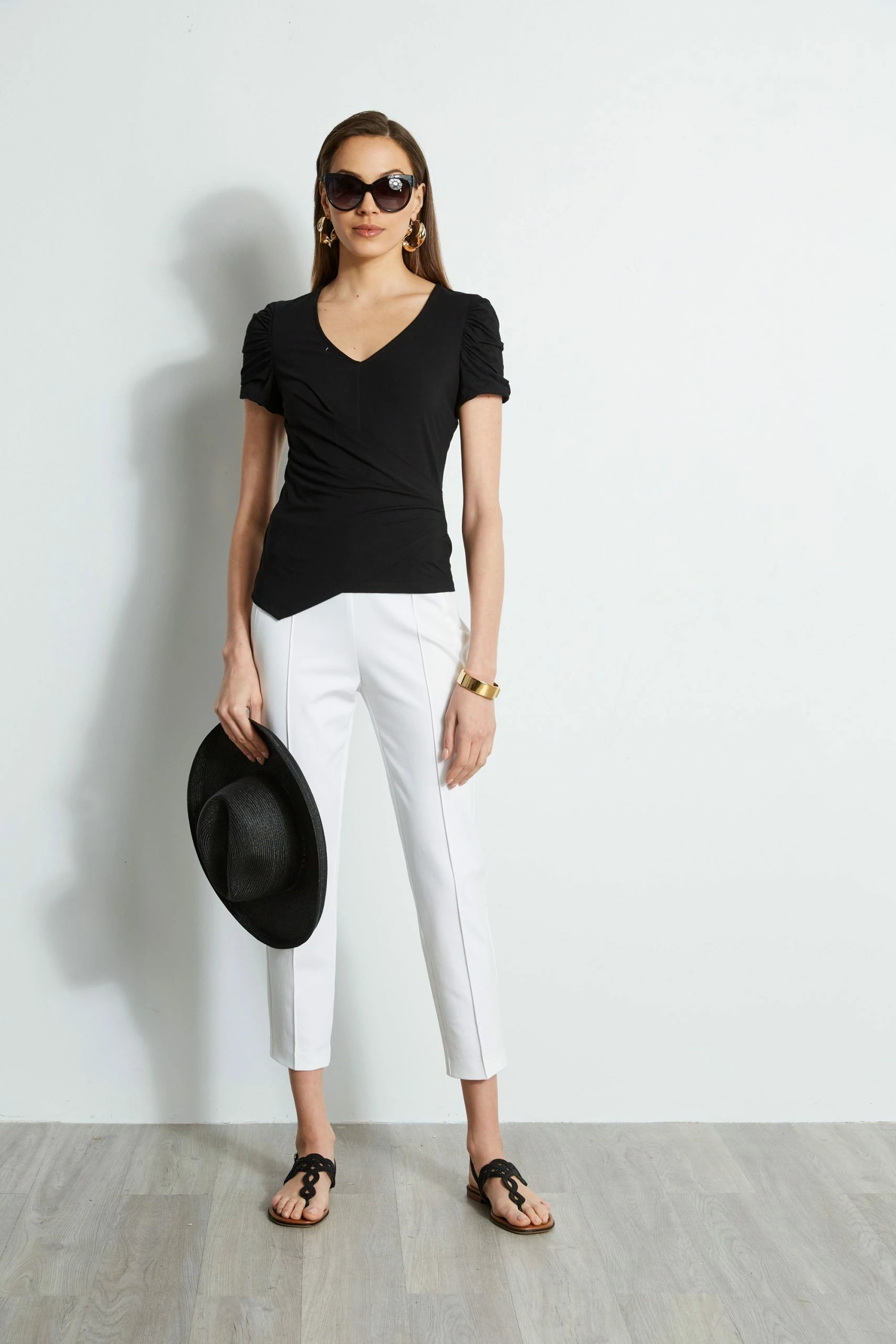 We love the modernity of our V-Neck Puff Sleeve Knit. Effortlessly cool this knit will add fashion and function to your Spring look. Done in luxe Jersey with an asymmetric hem & side ruching, this piece adds a design twist to your Tee closet.Â