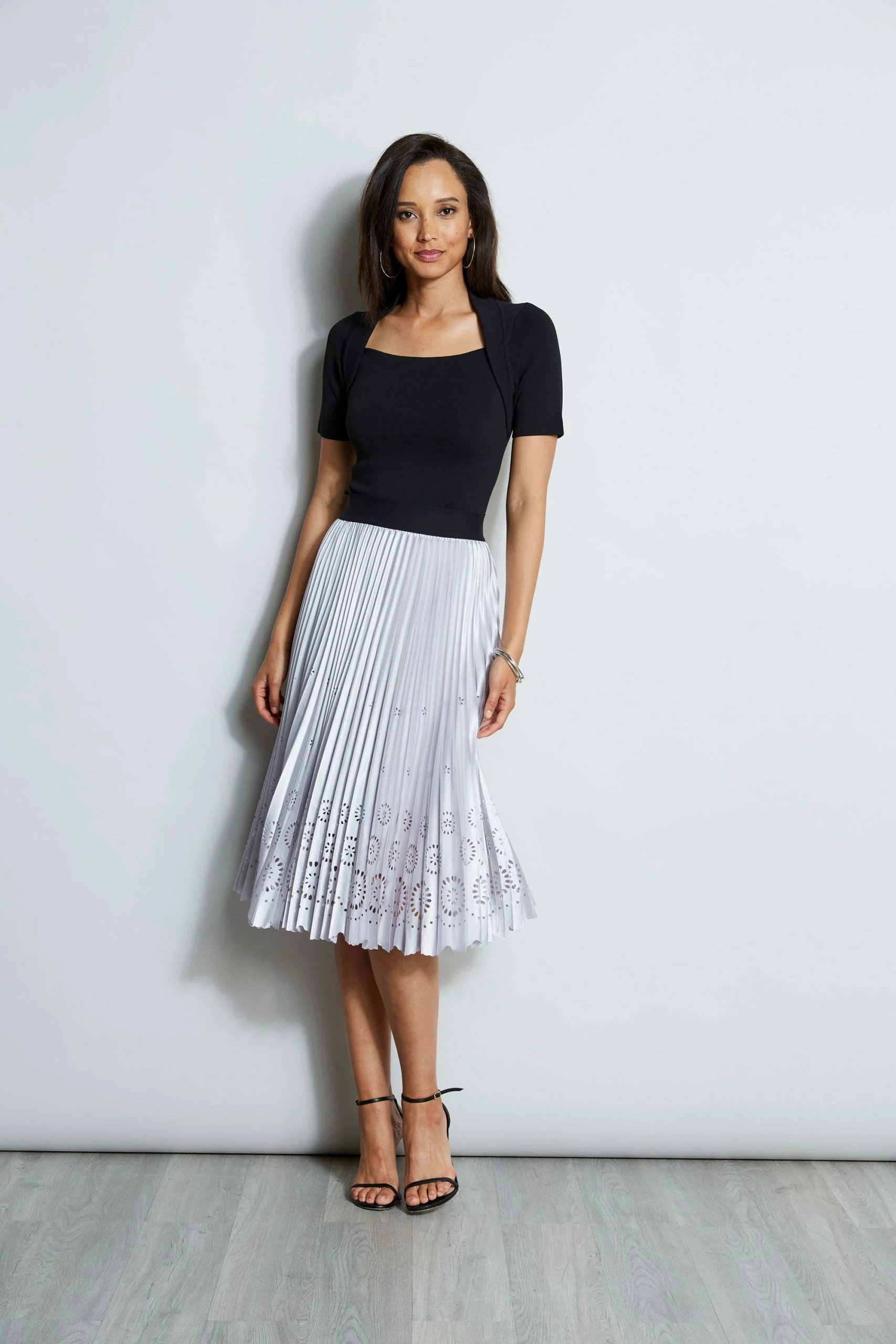 - Platinum Metallic Laser Cut Hem Pleated Midi Skirt with Elastic Waist