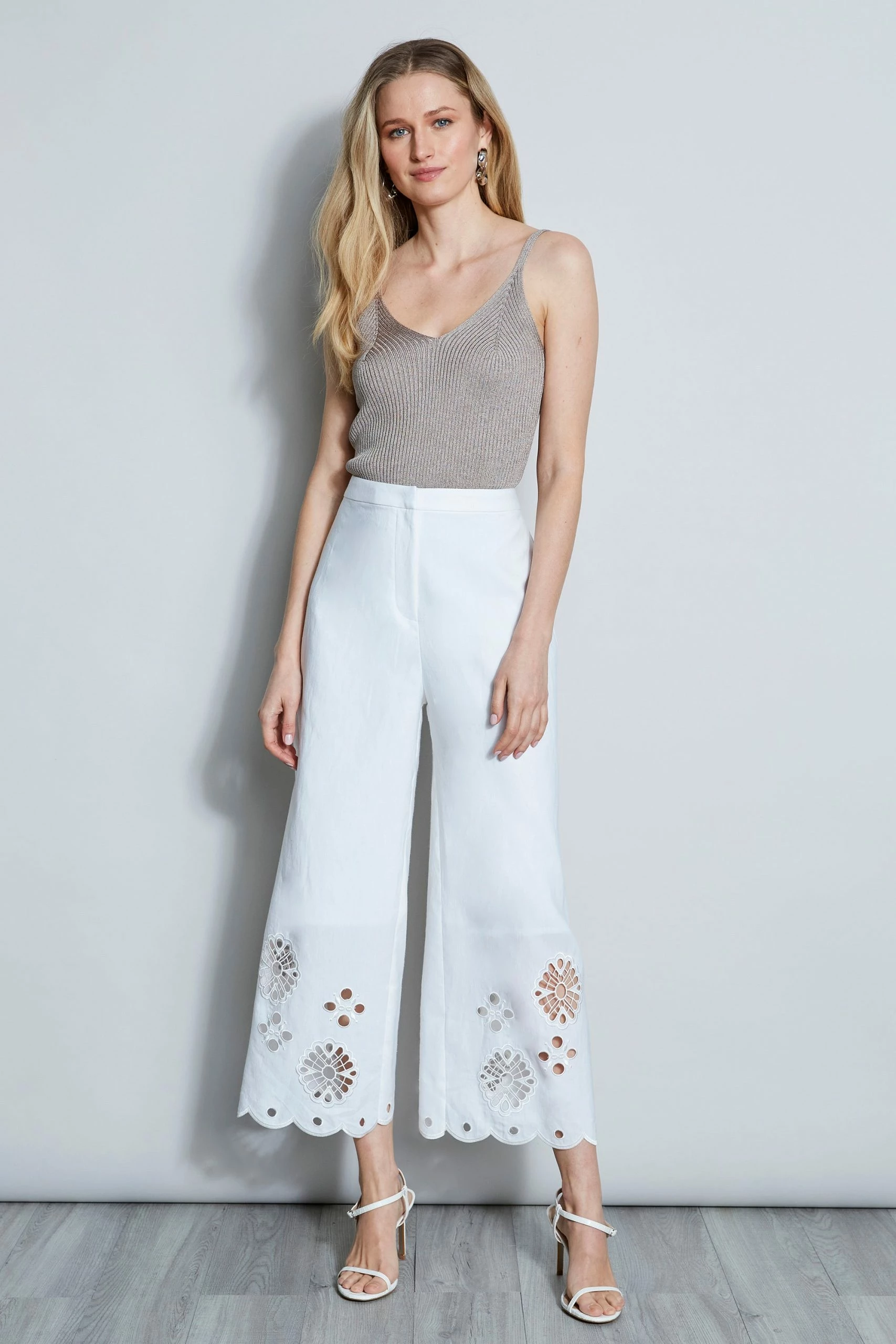 - Linen Wide Leg, High Rise, Cropped Pant with Embroidered Scallop Hem