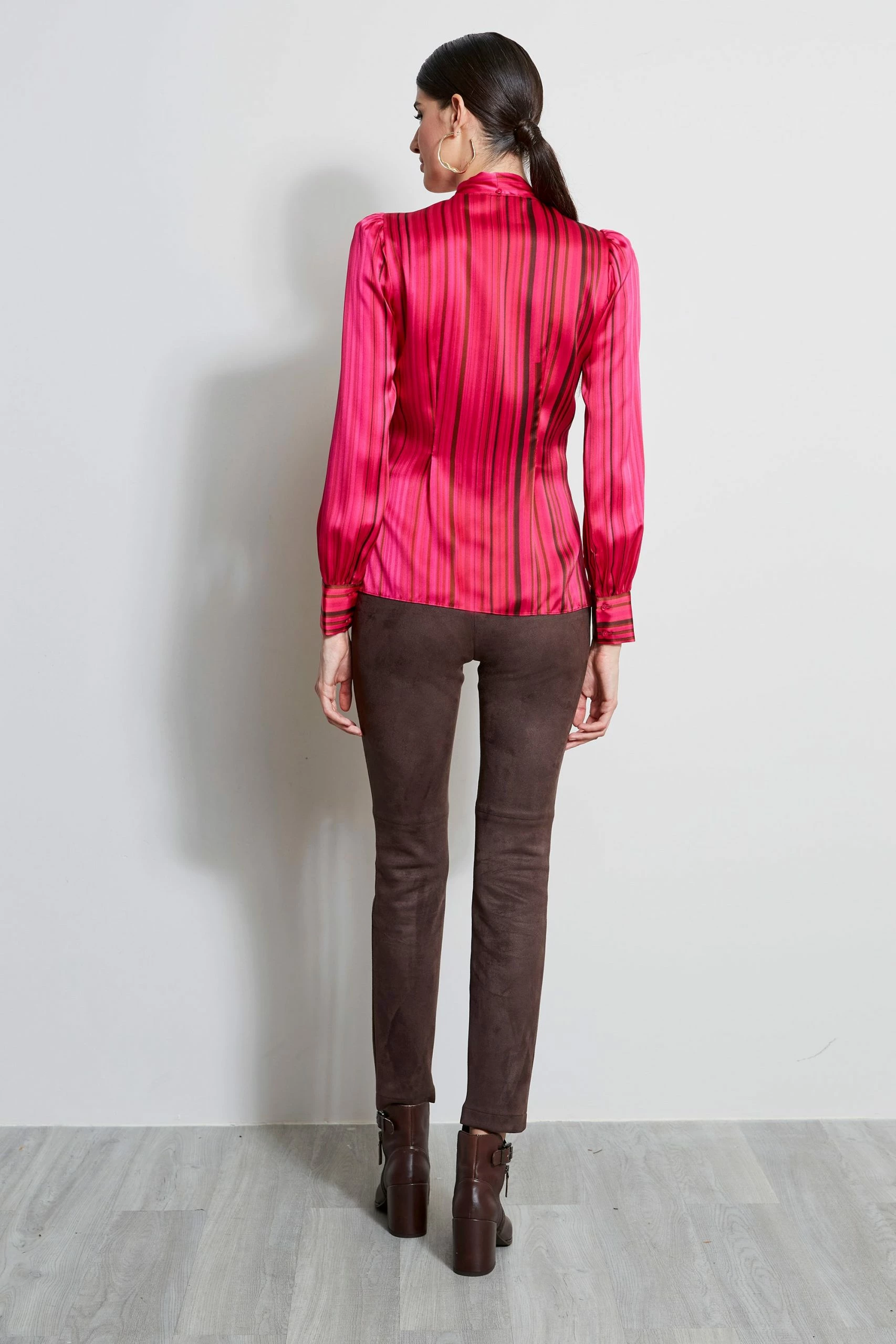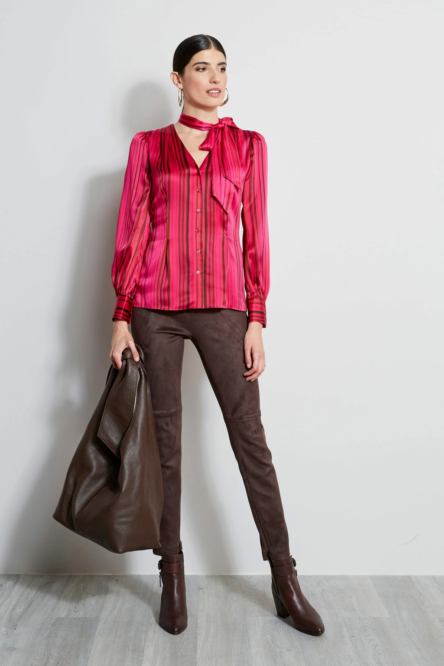 A chic removable neck tie and softly gathered sleeves lend a feminine twist to this season’s must have shirt. Crafted in luxe silk satin, our Echo Stripe print is vibrant & sophisticated. Pair it with our vegan suede espresso leggings or utility pant for the perfect Fall look.