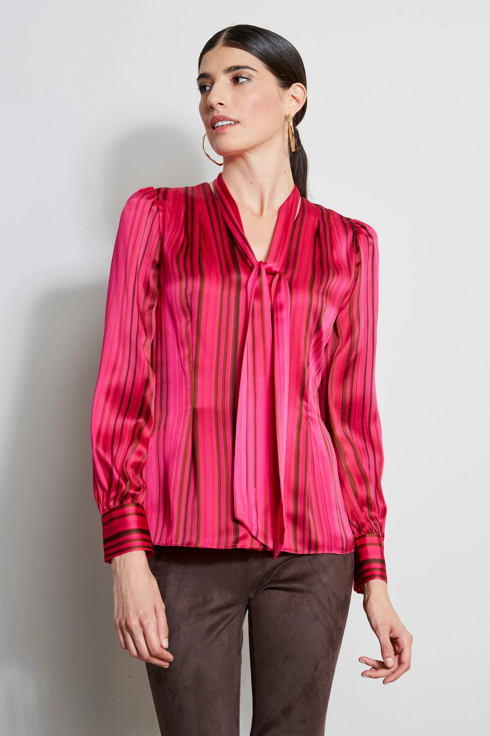 - Luxe Silk Satin Printed Stripe Shirt with Neck Tie & V-Neckline