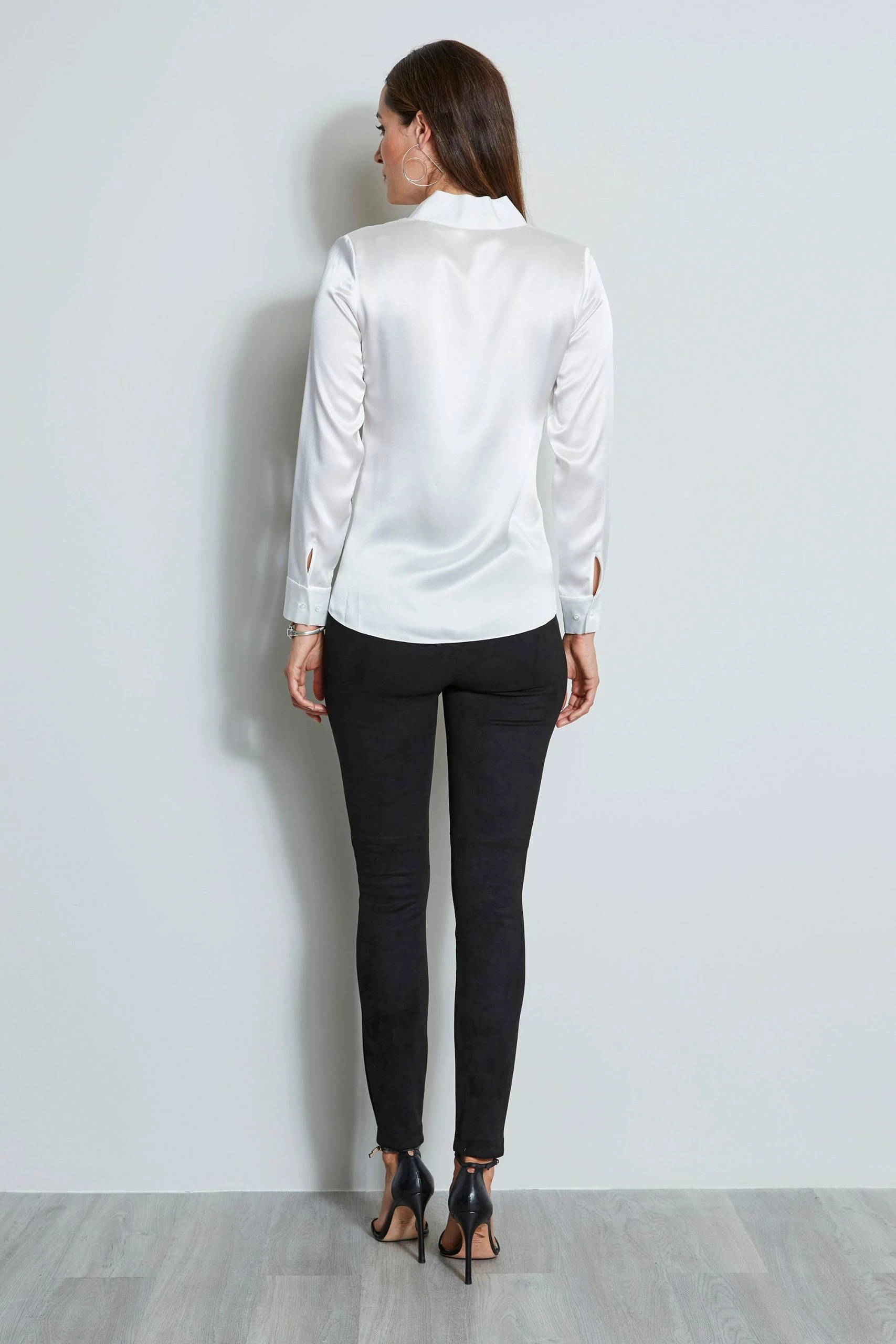 It’s all in the details. Modern with its ribbon stand collar neckline, this long sleeve Silk Georgette shirt features a charming Chiffon cascading ruffle. Dress it up with heels or down with our denim for a fresh take on a must-have. Â