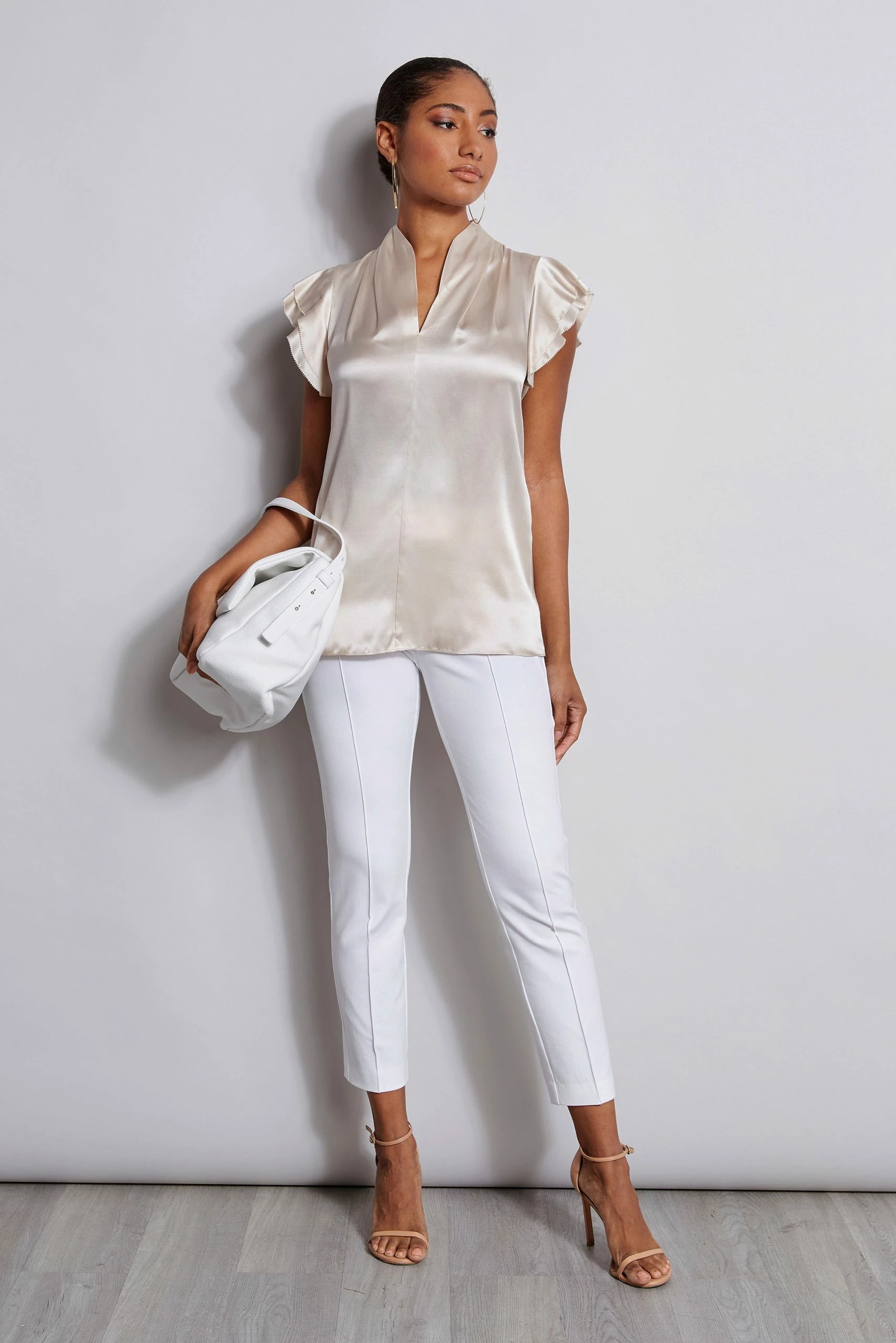 The soft flutter sleeves lend a femme twist to this luxe Silk Satin top. With its contour pleat detail neckline, it is perfect for layering with your favorite blazer or wearing on its own.