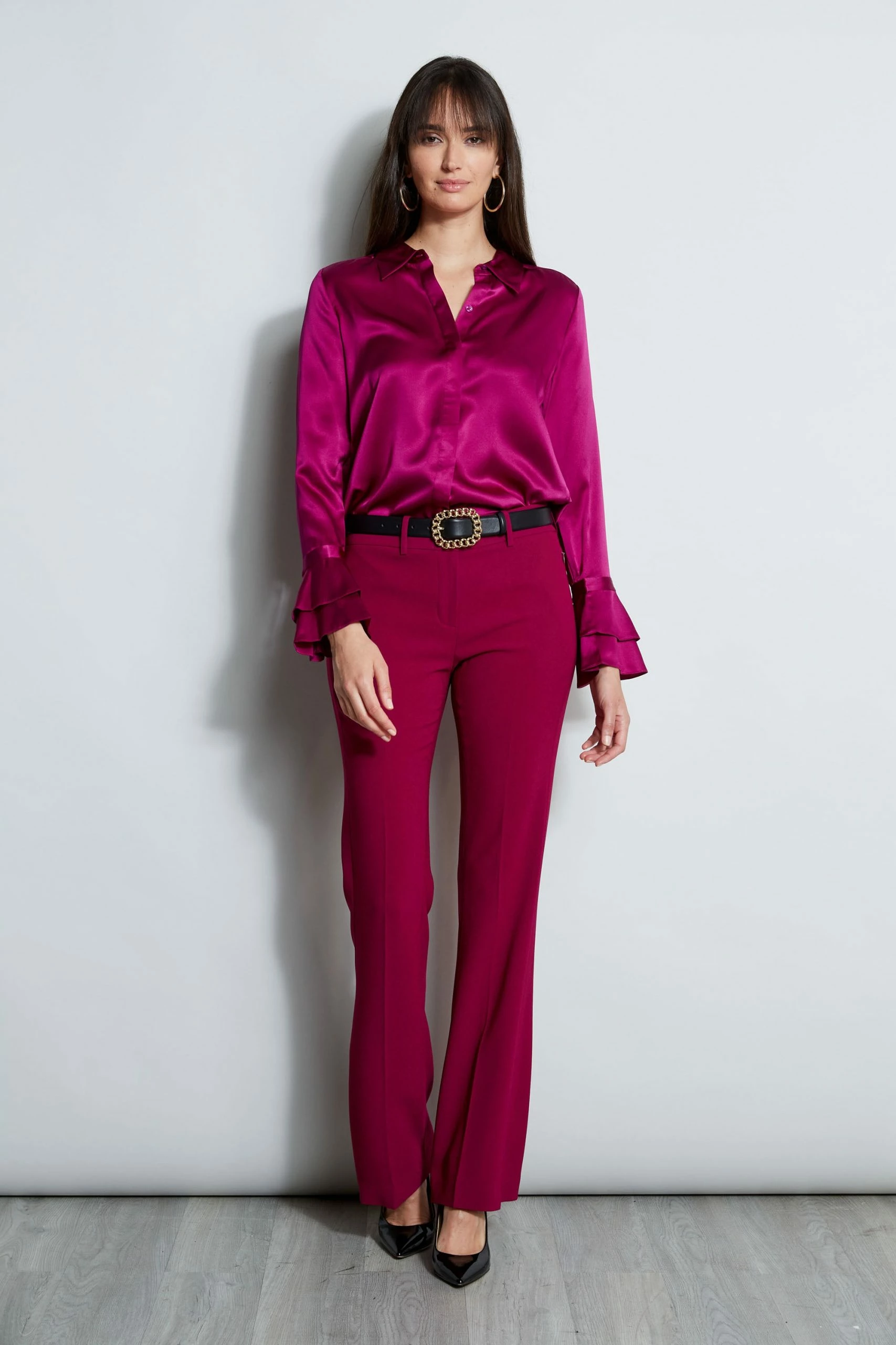 Nothing compares to the chic factor and luxe patina of our Silk Satin shirt. Its classic button-down style features a hidden placket & tiered ruffle cuffs. Perfect for layering under a blazer or wearing on its own- you will live in this shirt all season long.