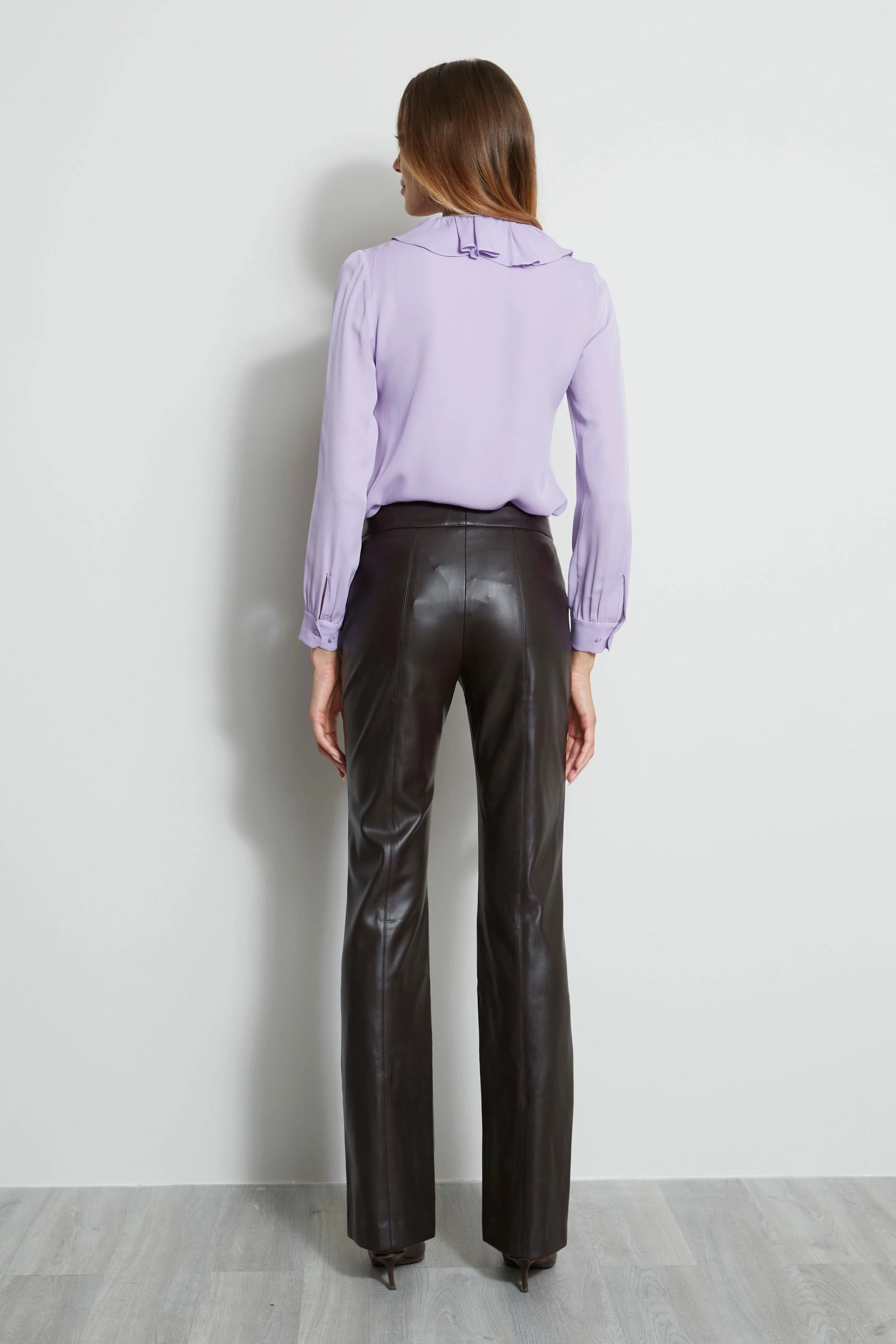 The soft ruffle & necktie lend a modern femme vibe to our Cascade Neck shirt. Styled in luxe Silk Georgette, it is a soft counterpoint to this season’s sleek vegan pants and dark-washed denim.