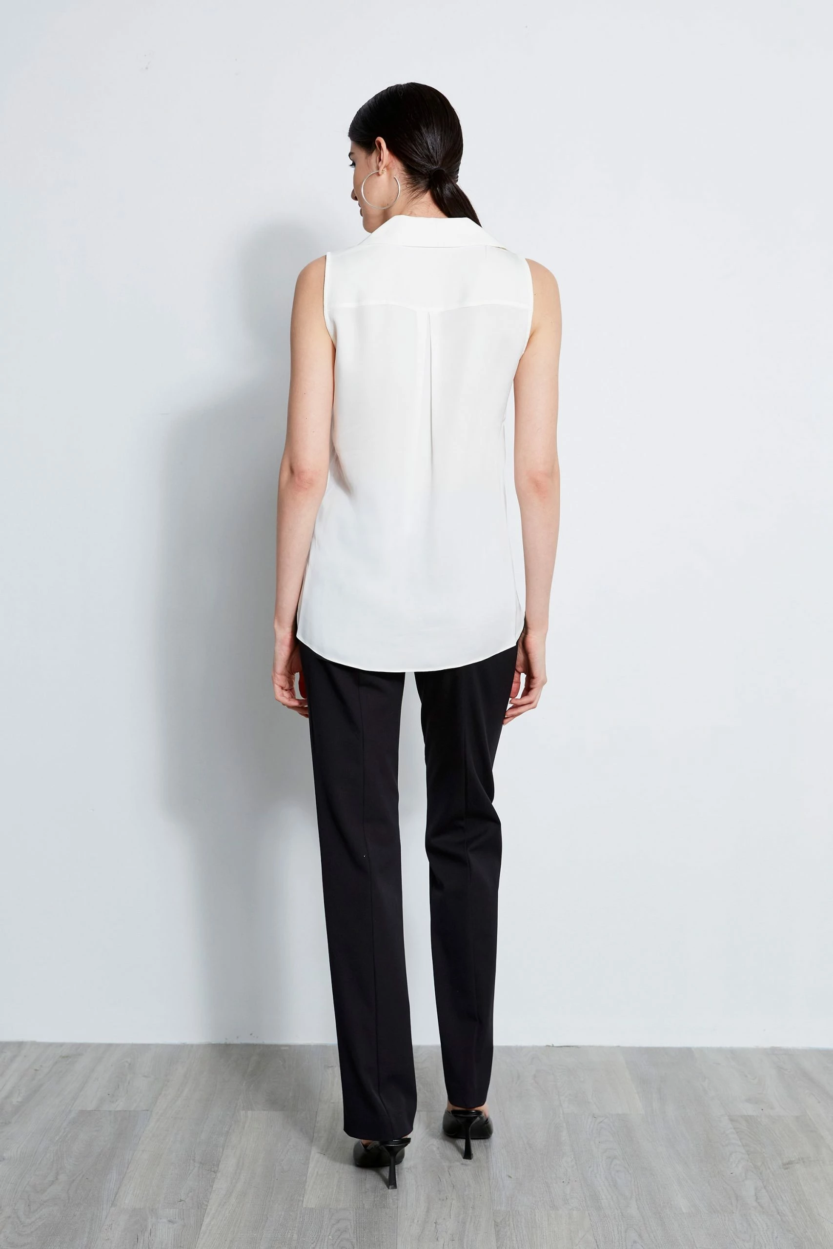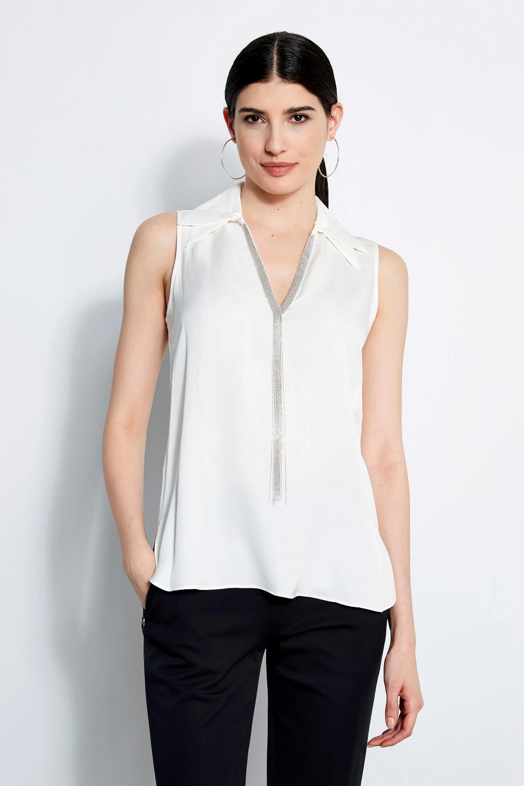 - Sleeveless Silk V-Neck Shirt with Chain Fringe Detail & Double Collar Neckline
