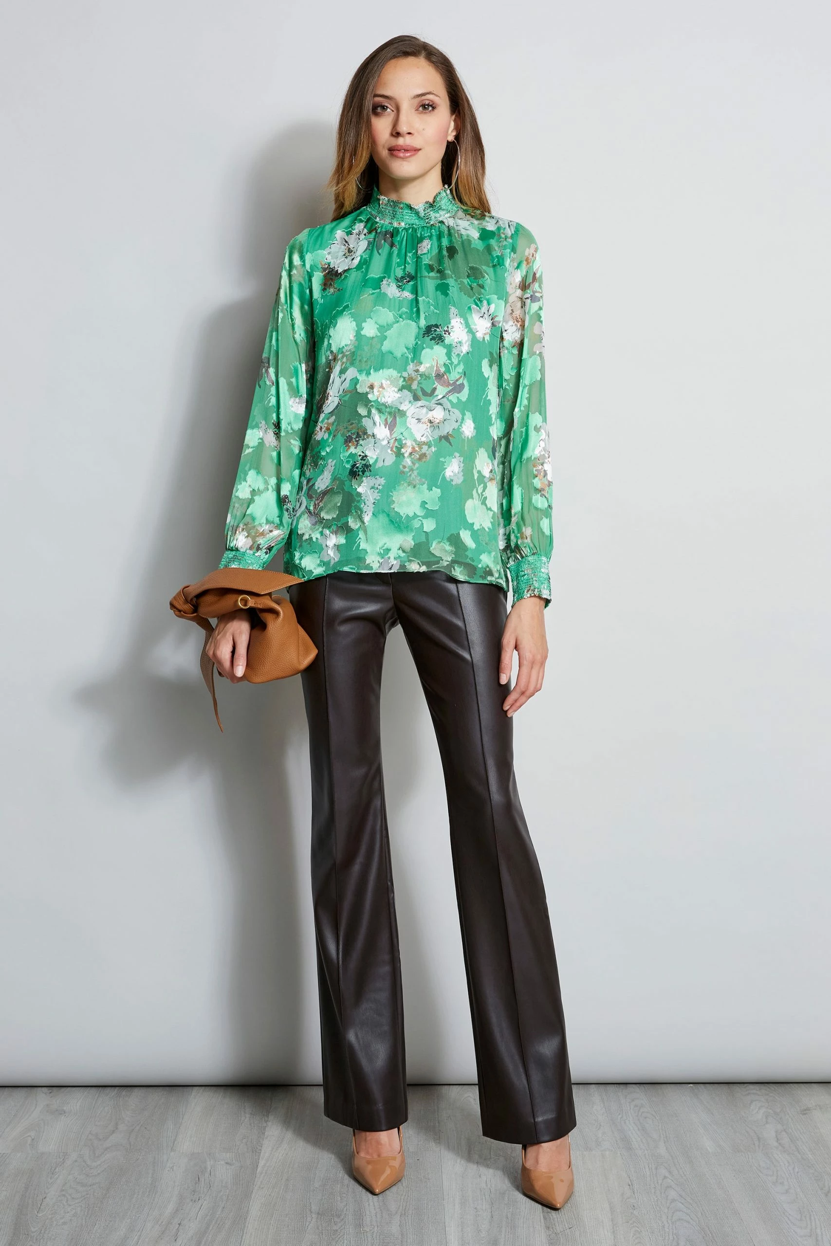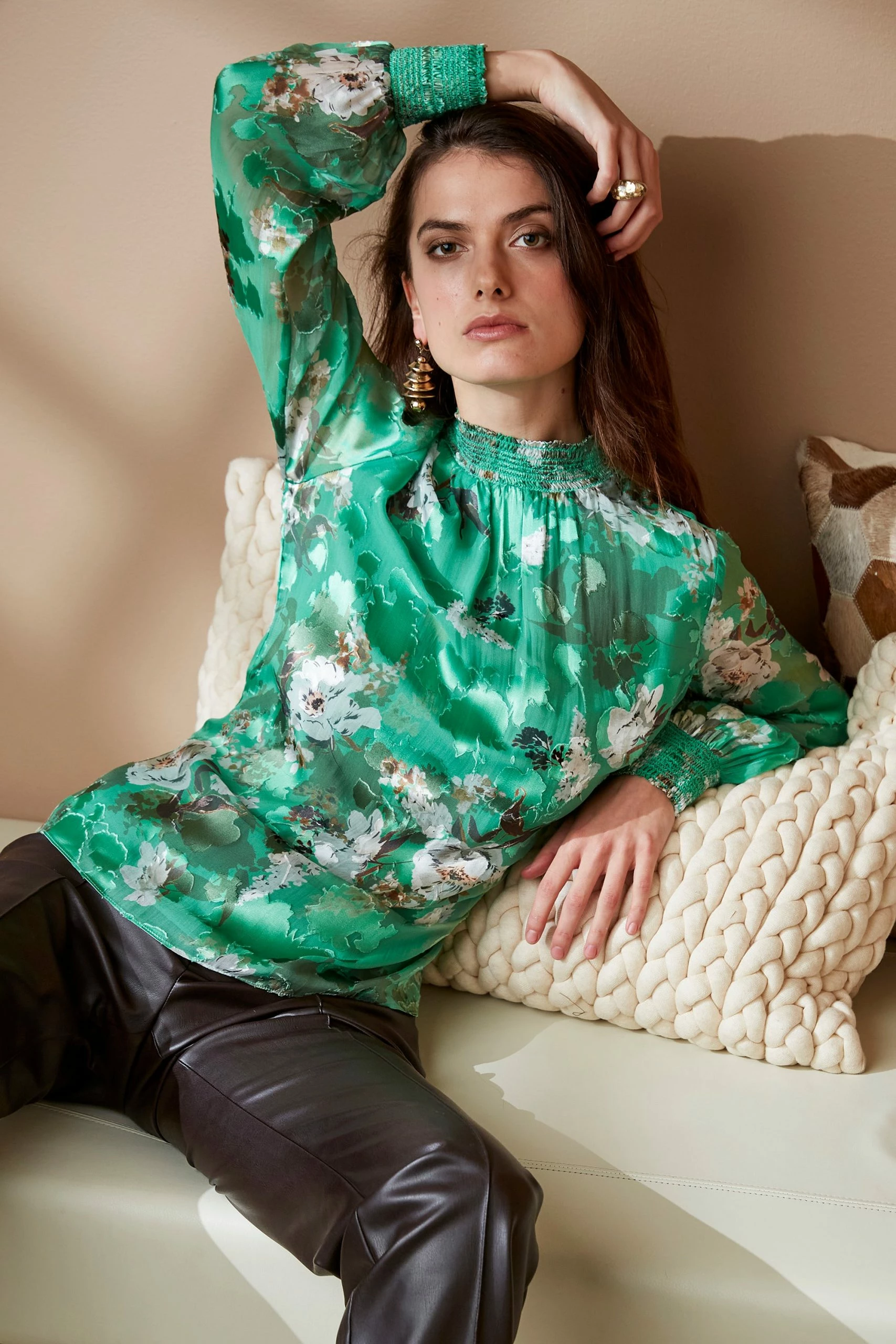 - Silk Blend Smocked Mock Neck Long Sleeve Floral Printed