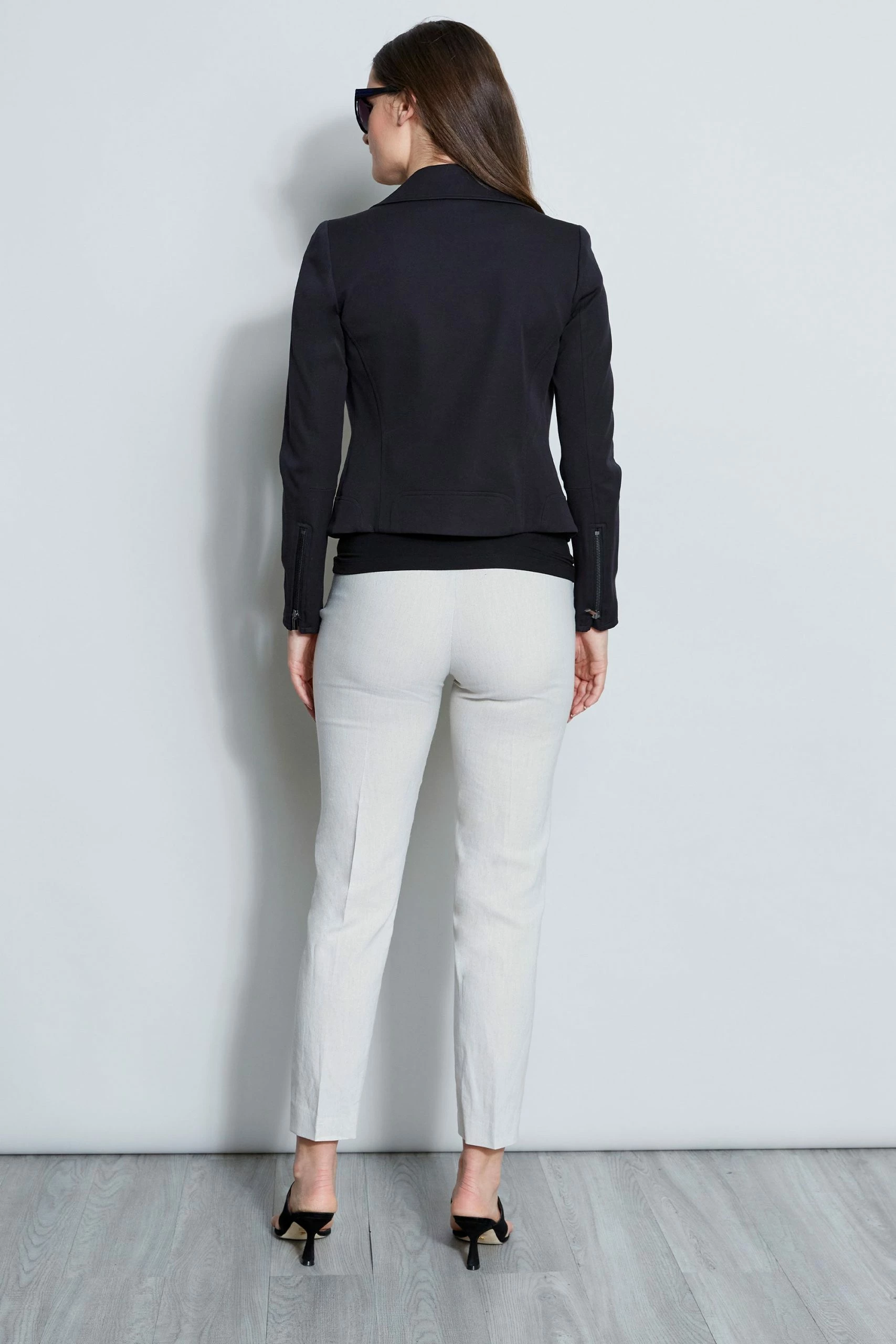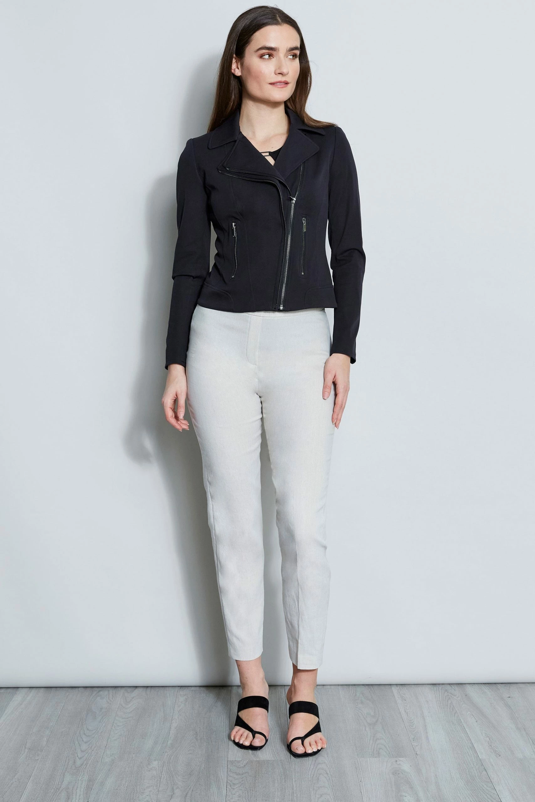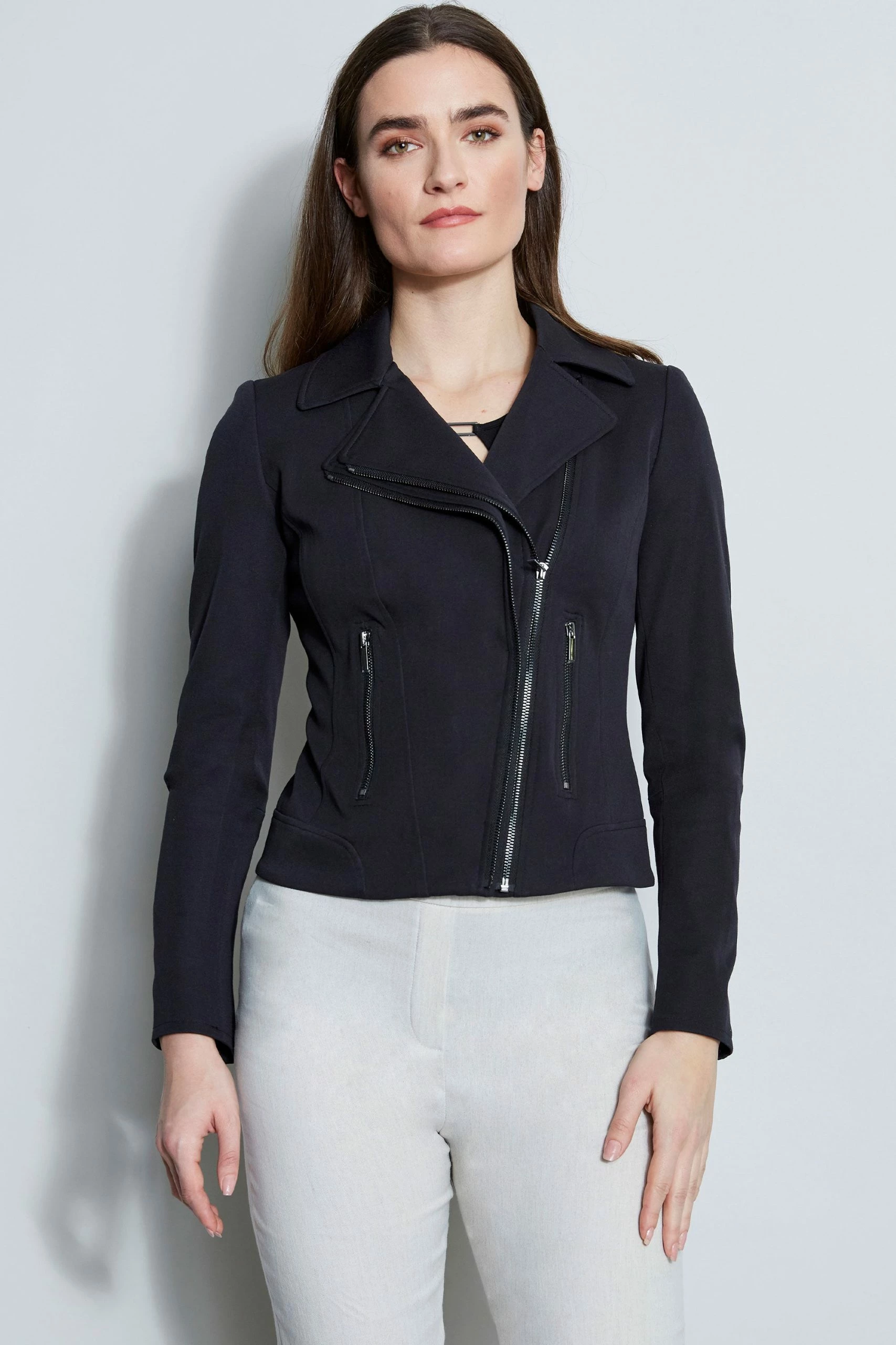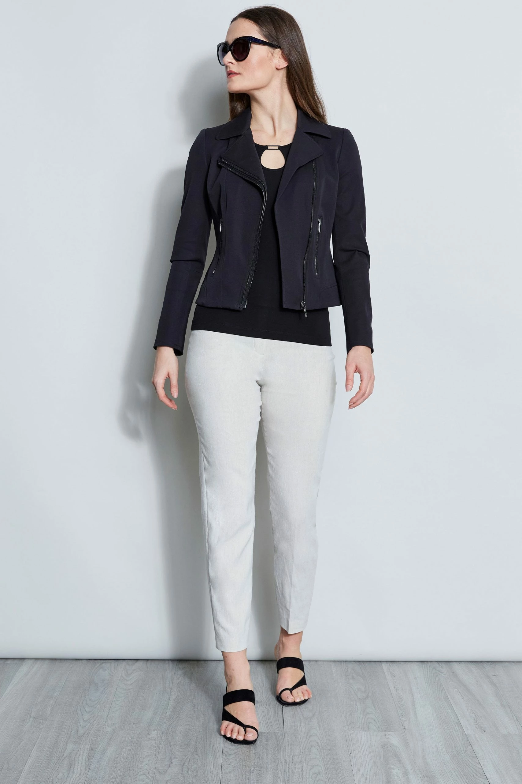 Our Stretch Twill Jacket has a modern vibe with its asymmetrical silhouette, metal zip closure & double layer lapel. Great with white denim or over a dress – this jacket completes every look.