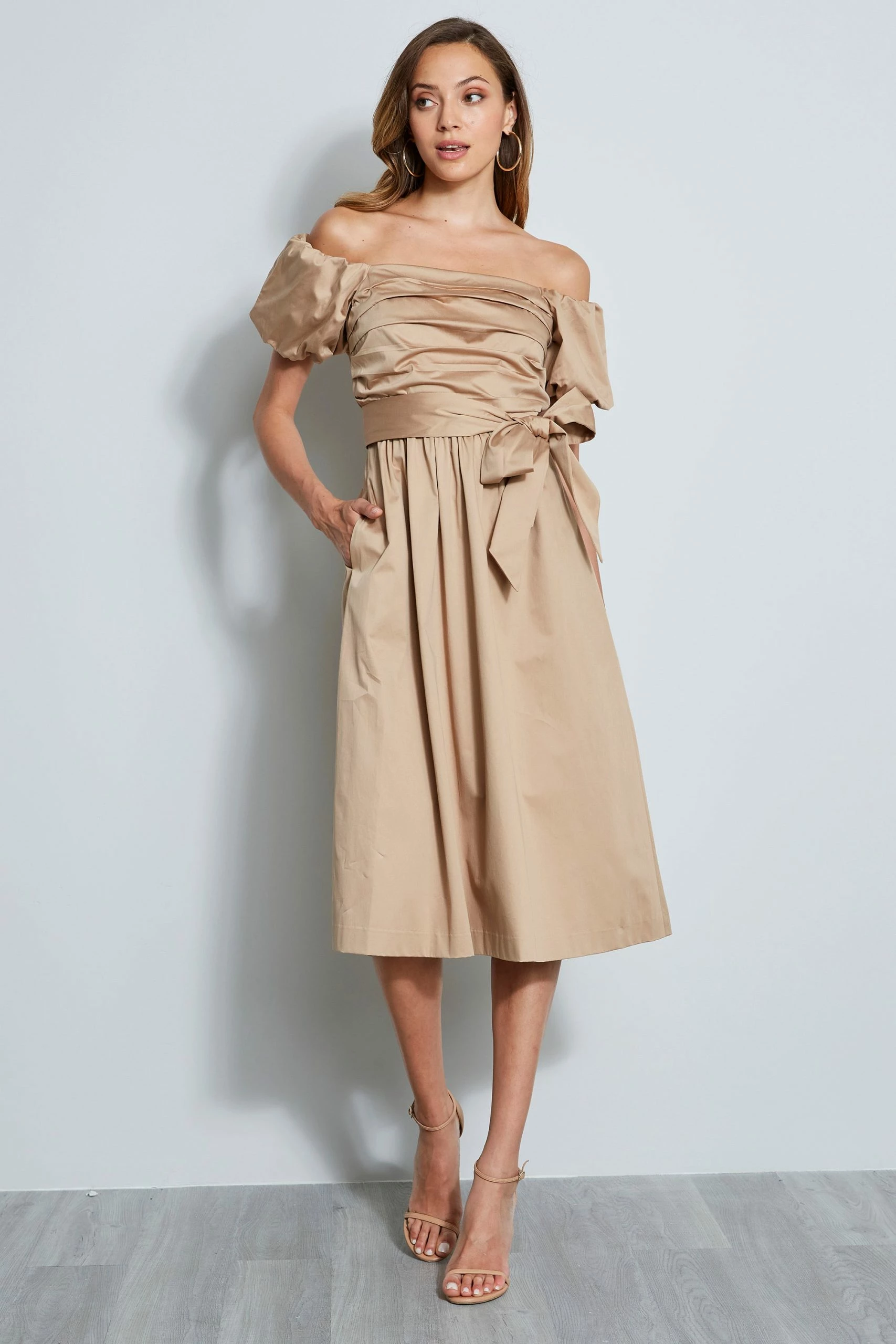 With the most romance and femininity you can find in one dress, the Topaz is a dream come true. Off the shoulders with a self sash and fuller skirt, you will love your sashay in this look