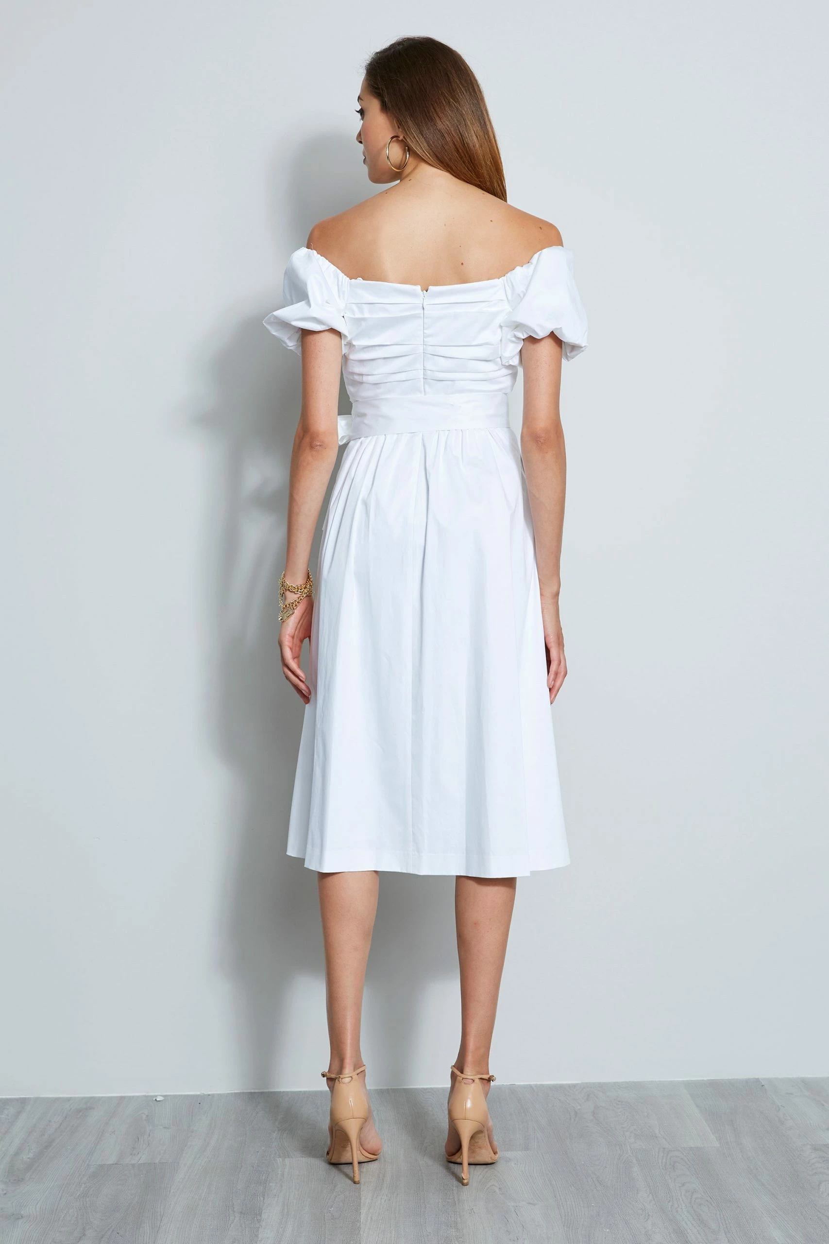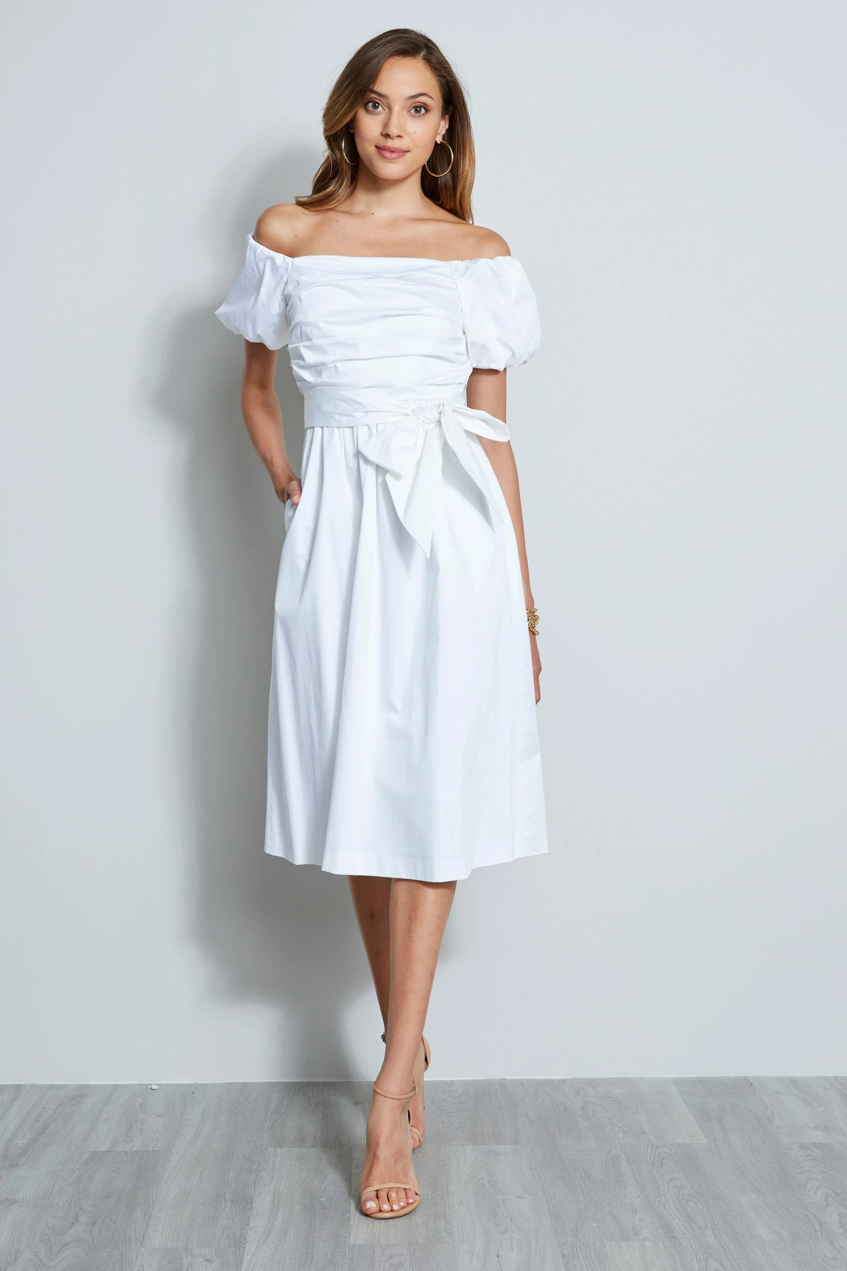 With the most romance and femininity you can find in one dress, the Topaz is a dream come true. Off the shoulders with a self sash and fuller skirt, you will love your sashay in this look.