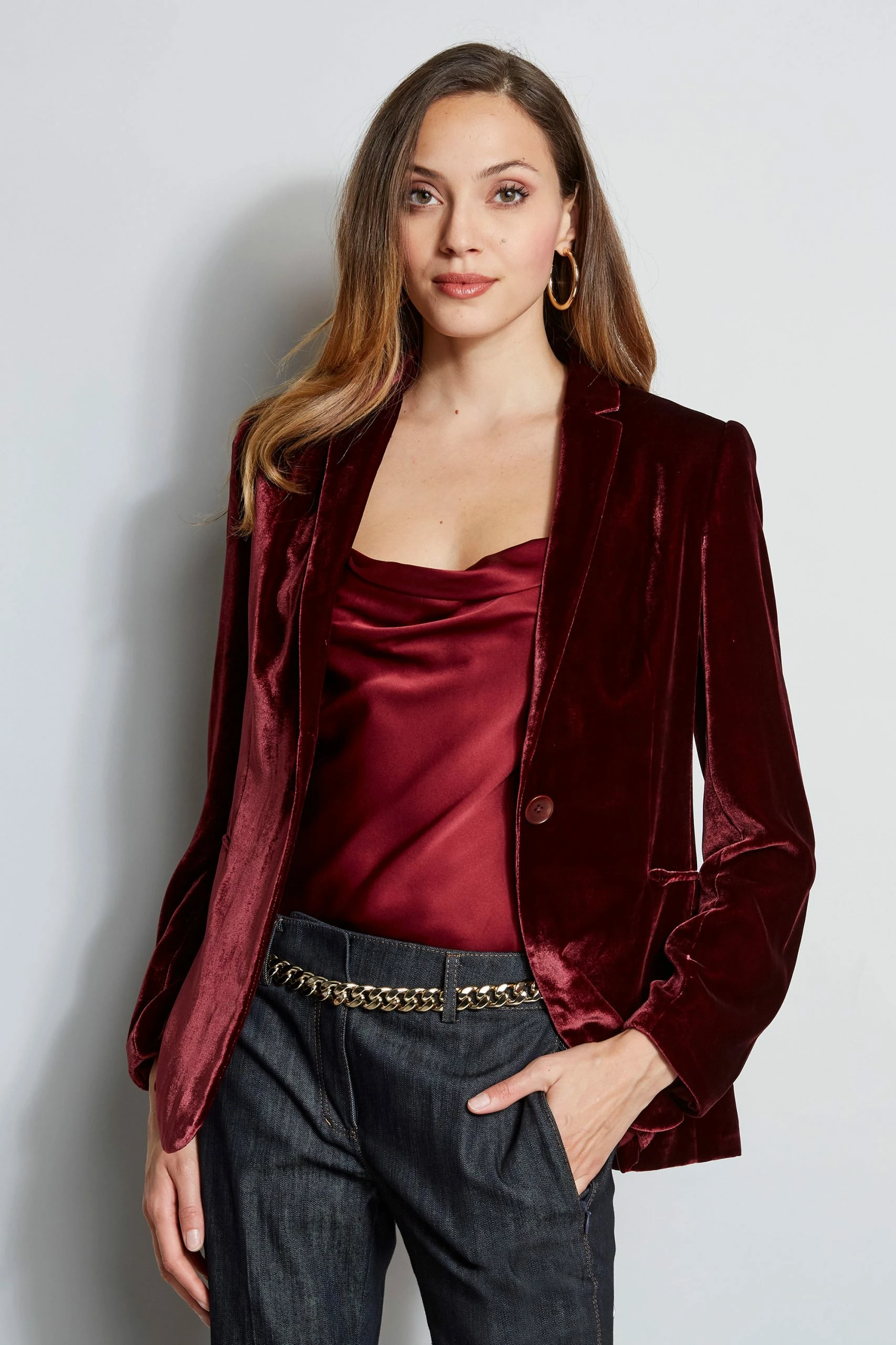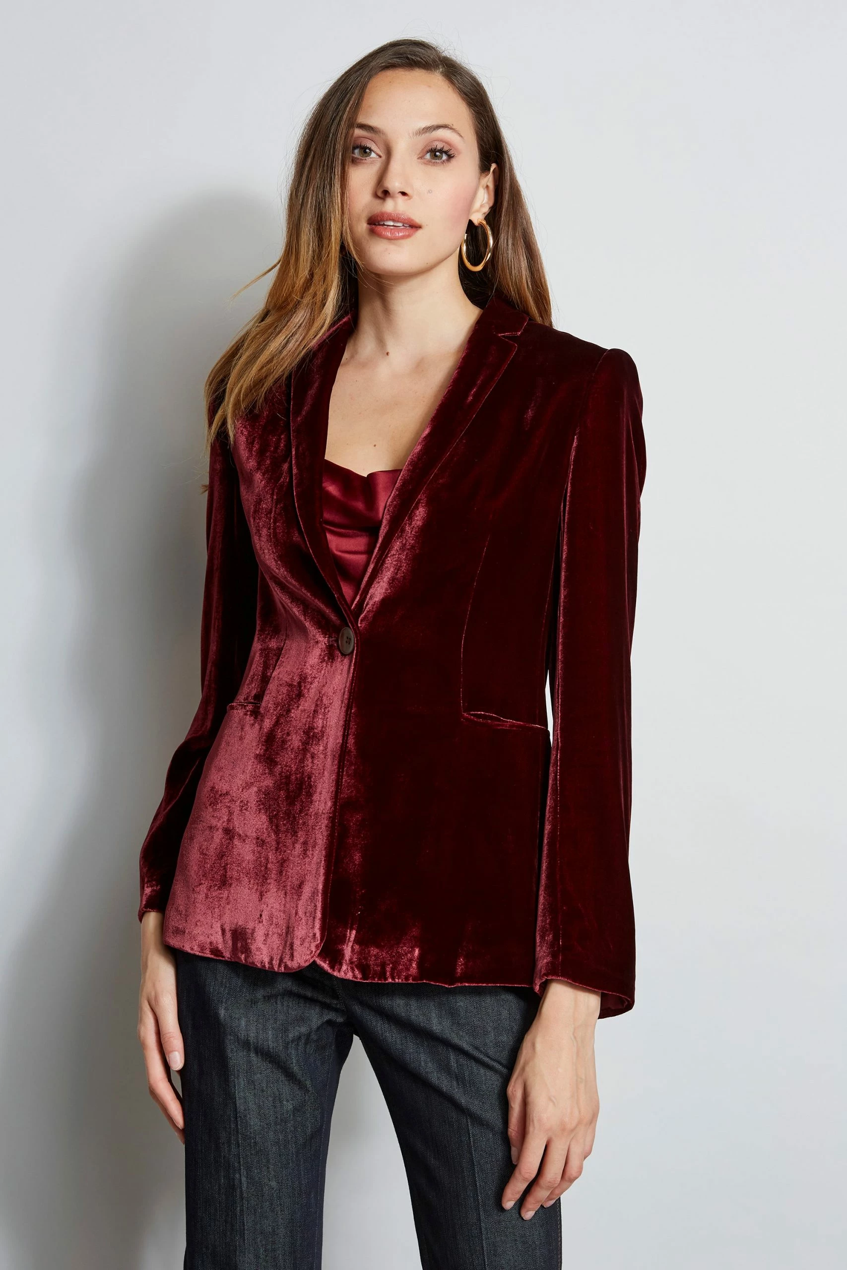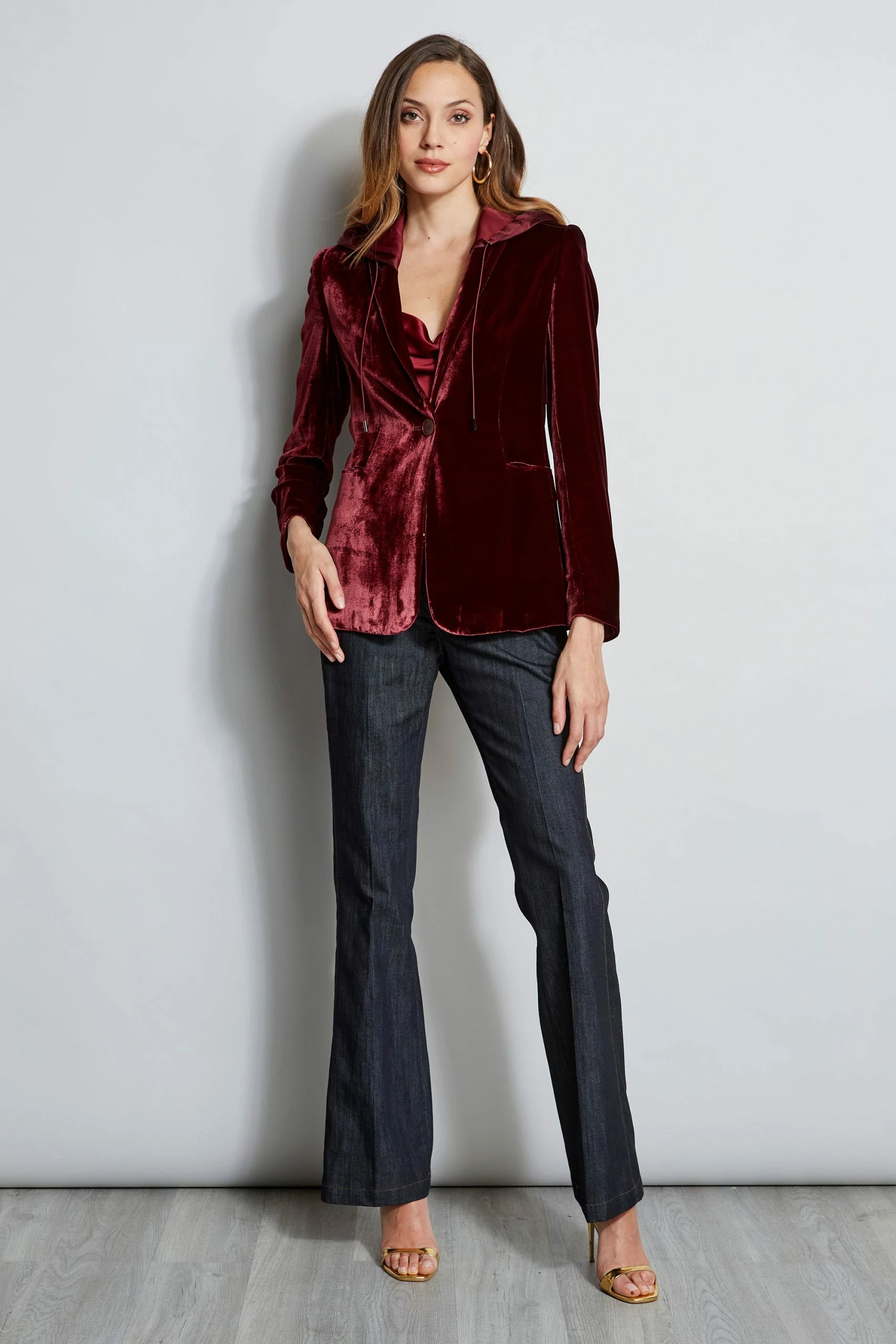 - One Button Velvet Blazer with Removable Silk Hood