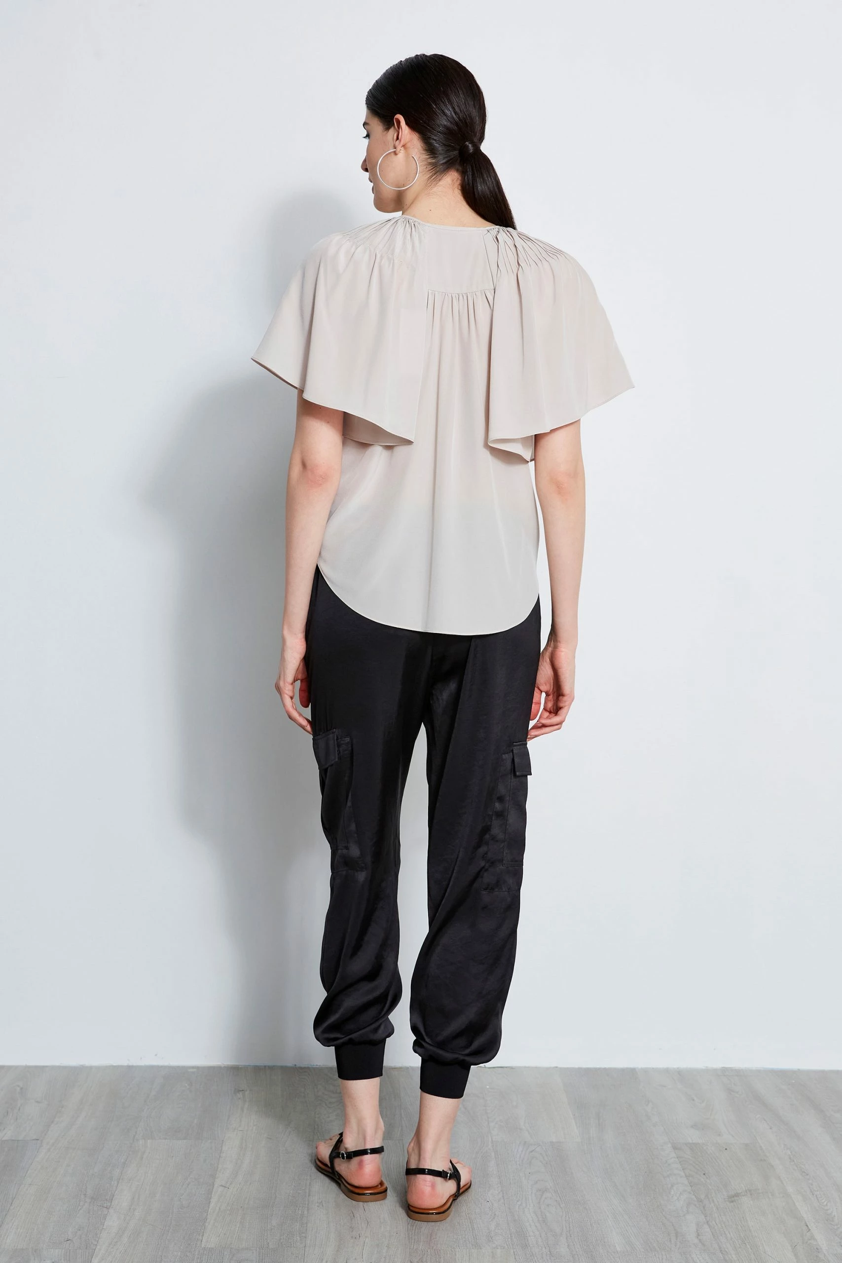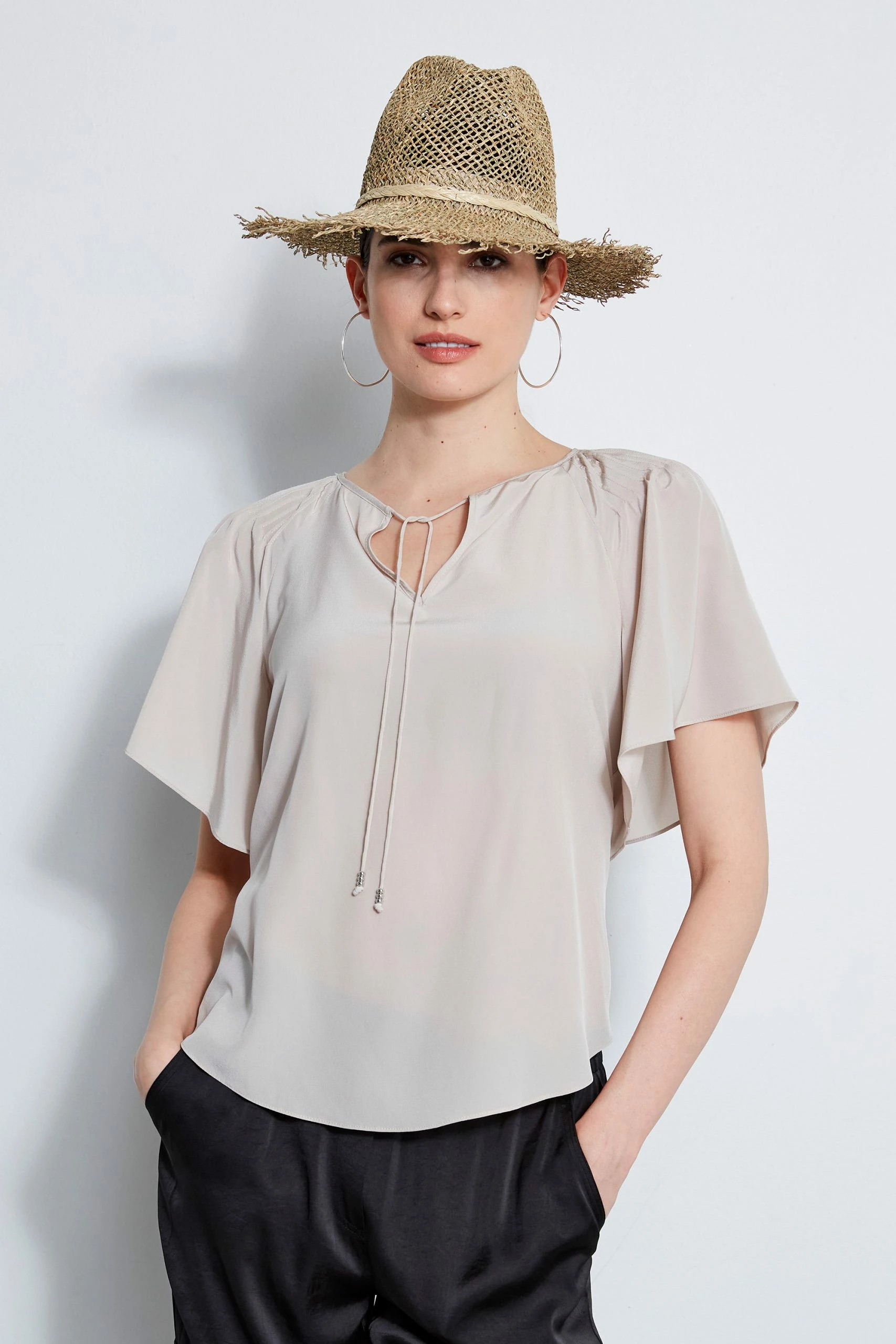 - Flutter Sleeve Silk Top with Slit Tie Neckline