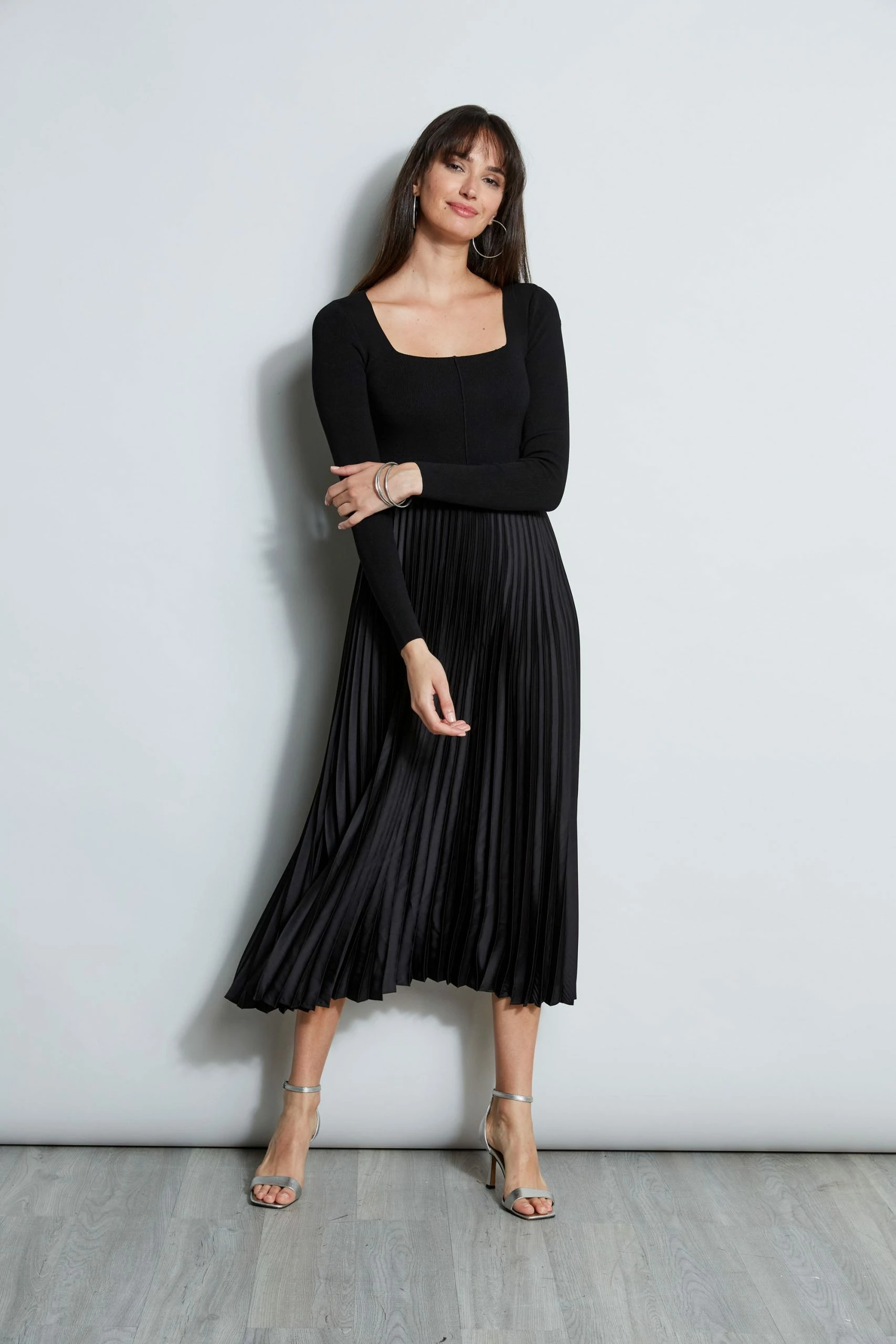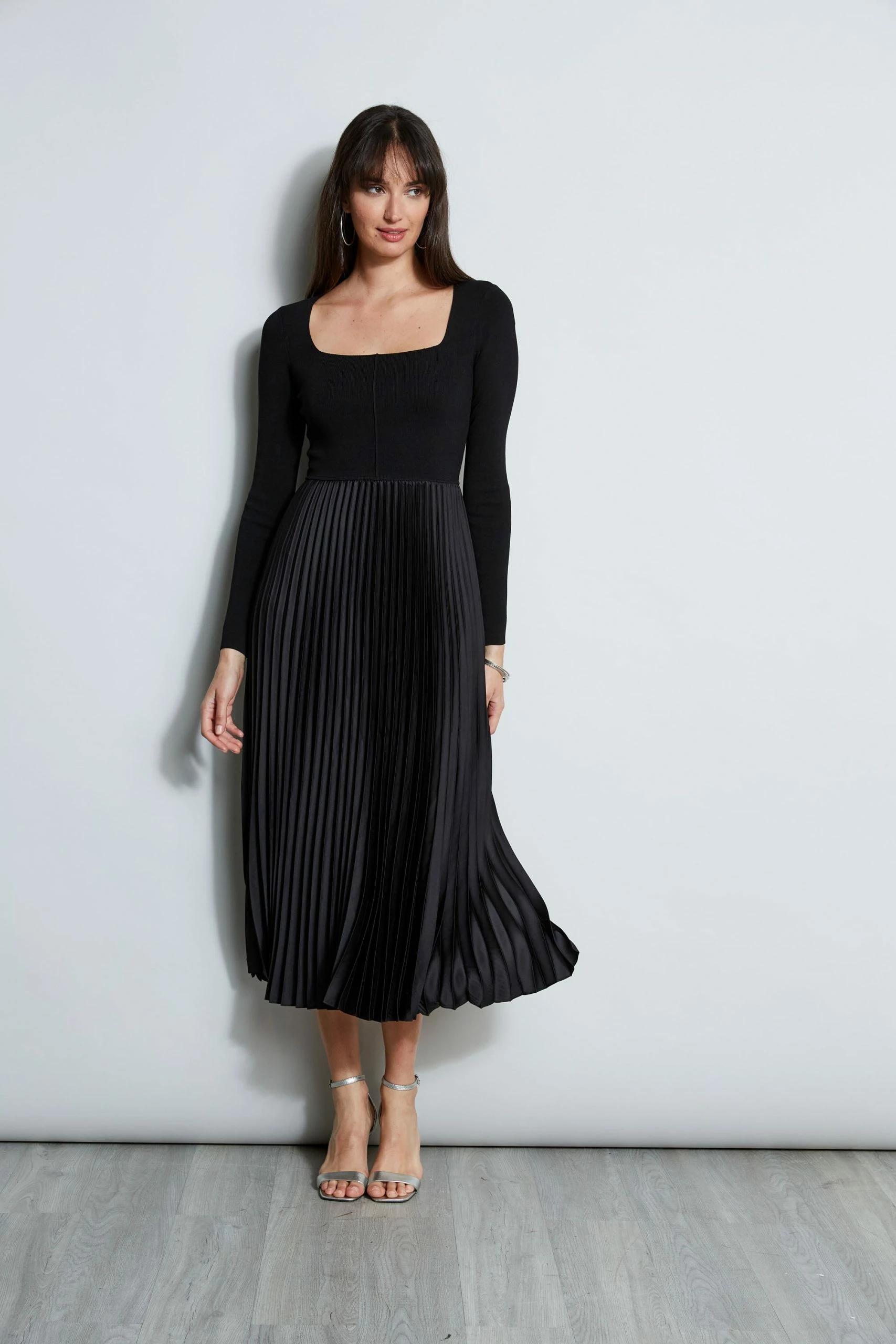 Our effortless Pleated Midi Dress has a distinct modern vibe. The viscose sweater square knit bodice combines with a pleated skirt with graphic asymmetric hem. Definitely poetry in motion!Â