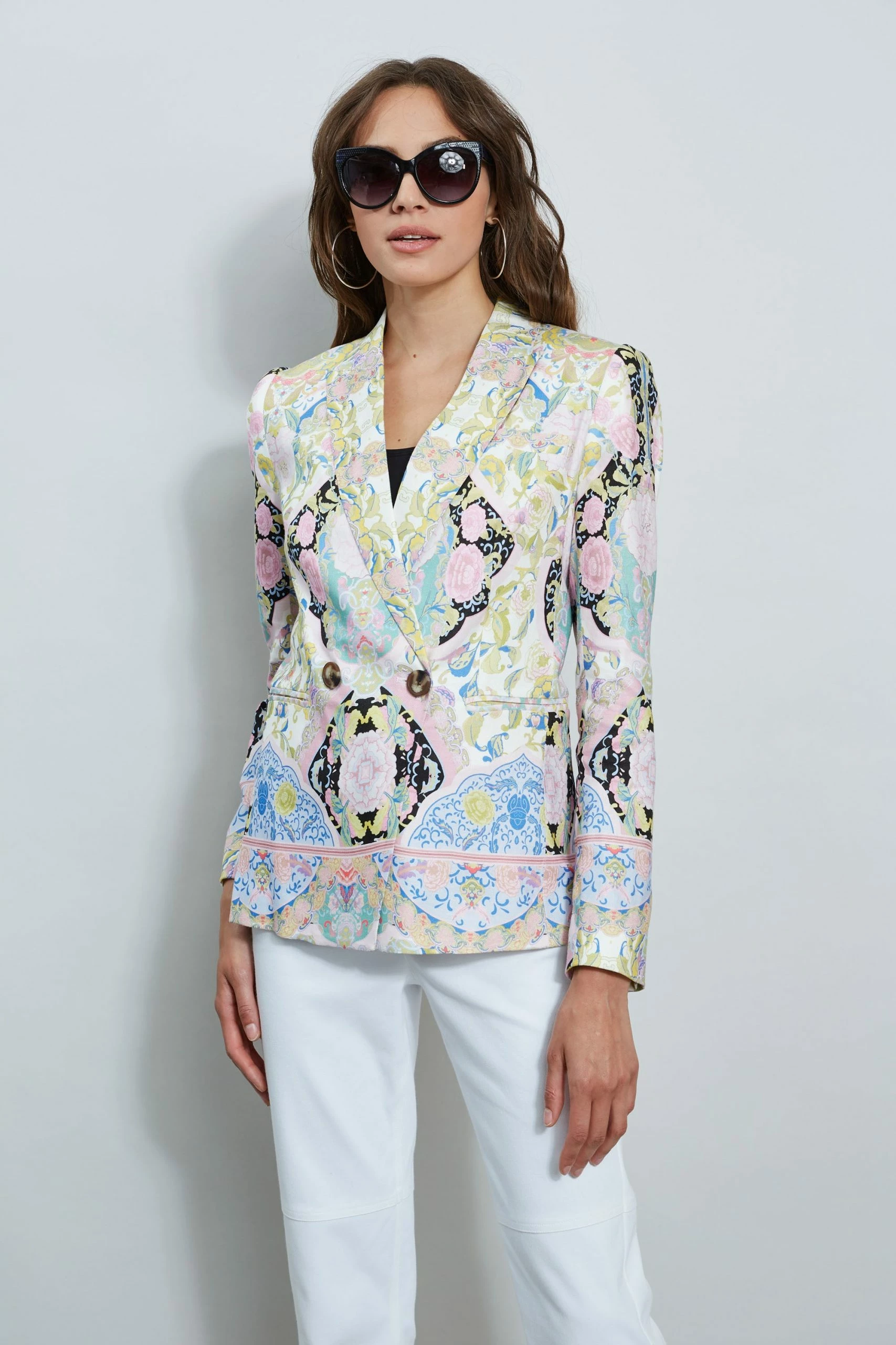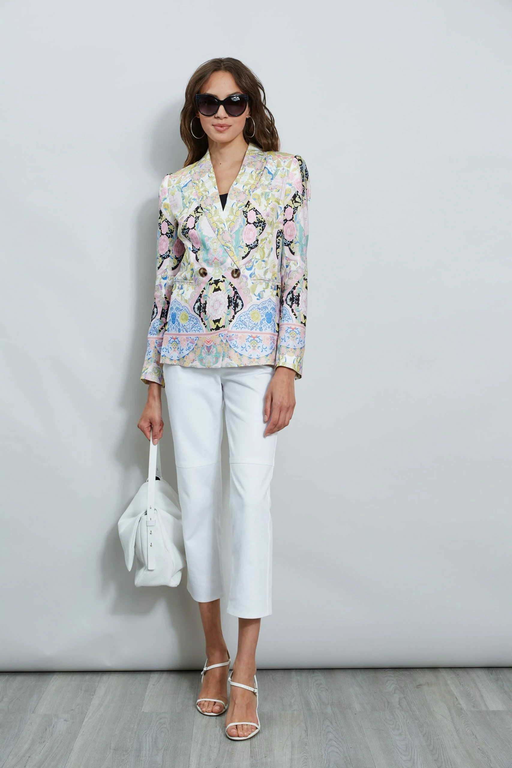 The Double Breasted Blazer is reimagined in a sophisticated Summer Damask print with tortoise button. Wear it casually with jeans or flats or pair it with its matching pant for a cool take on the suit.
