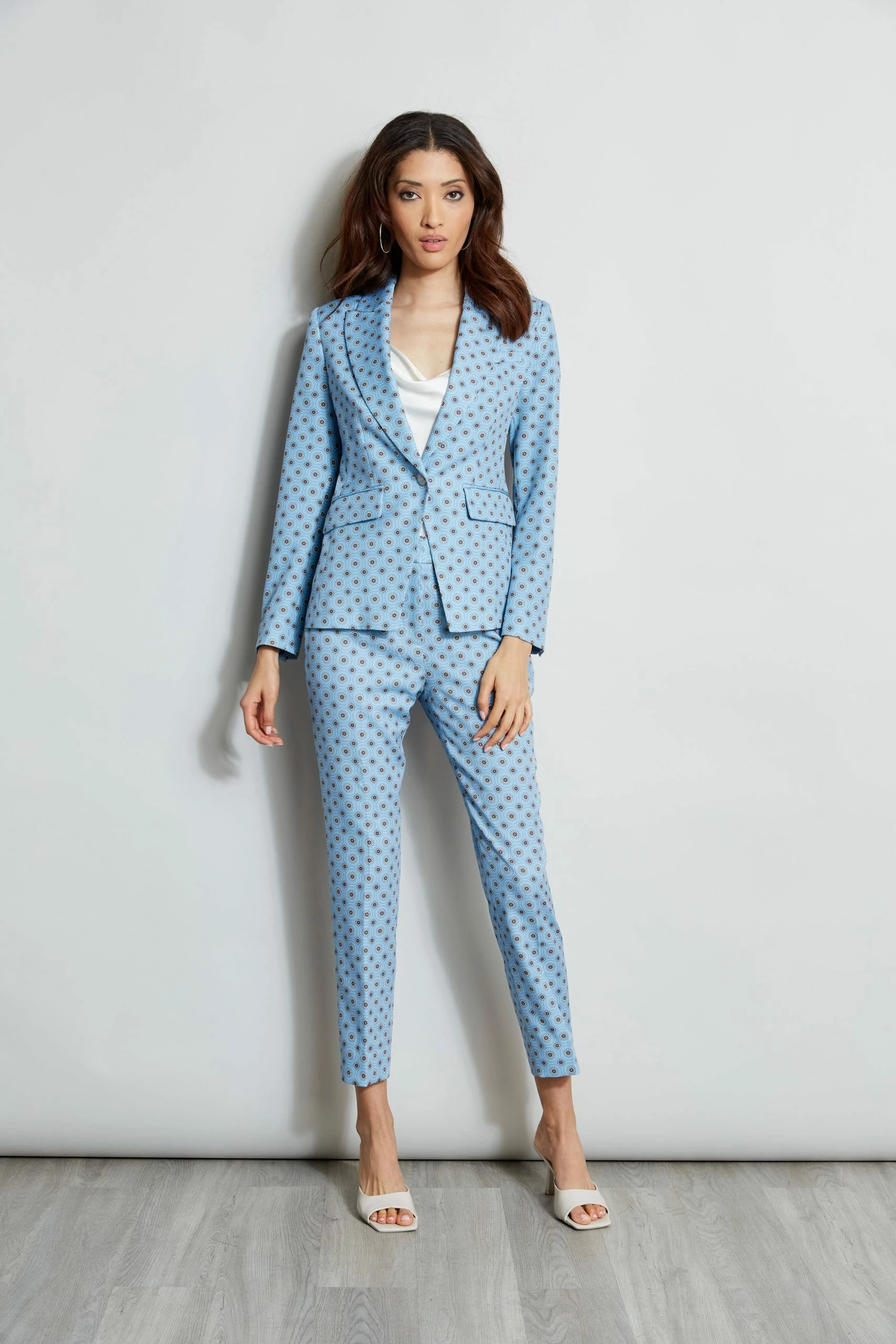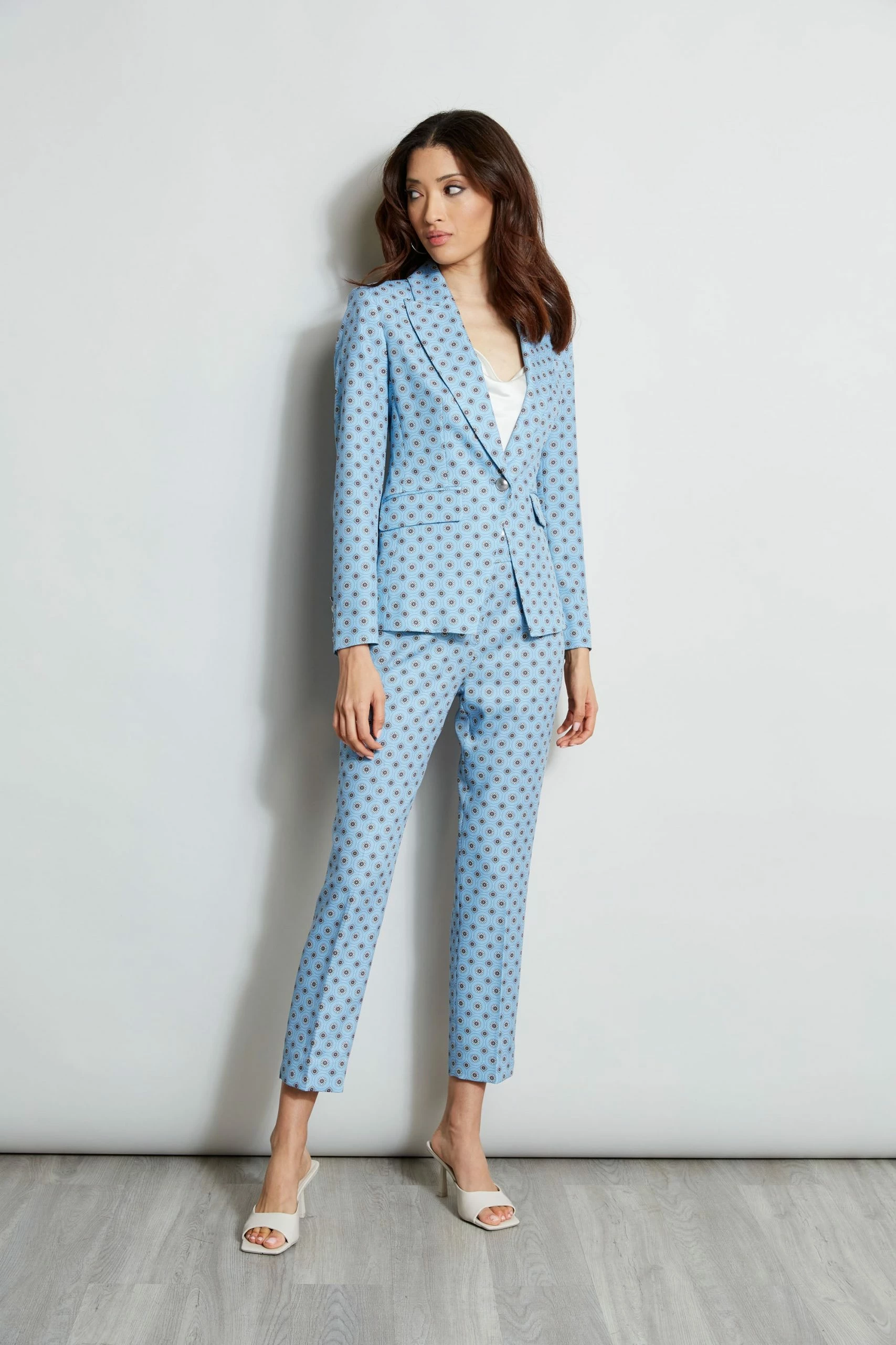 The Blazer is reimagined in a sophisticated geometric print with an antique gold crest button. Wear it casually with jeans or flats or pair it with its matching pant for a cool take on the suit.