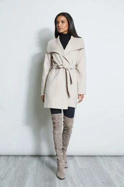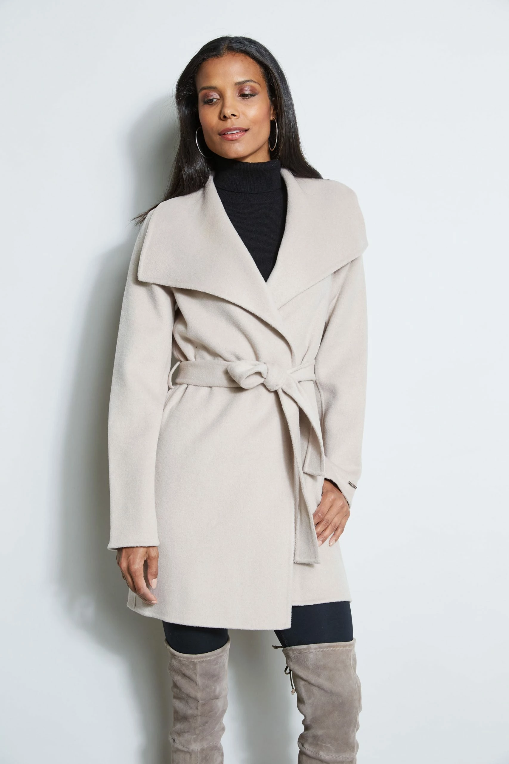 Layer up in our cozy chic Tahari wrap coat. This Wool blend unlined transitional piece features a dramatic lapel, self sash & side seam pockets. You will wear this all season long. Layer it over everything from chic dresses to falls must have Cashmere sweaters.