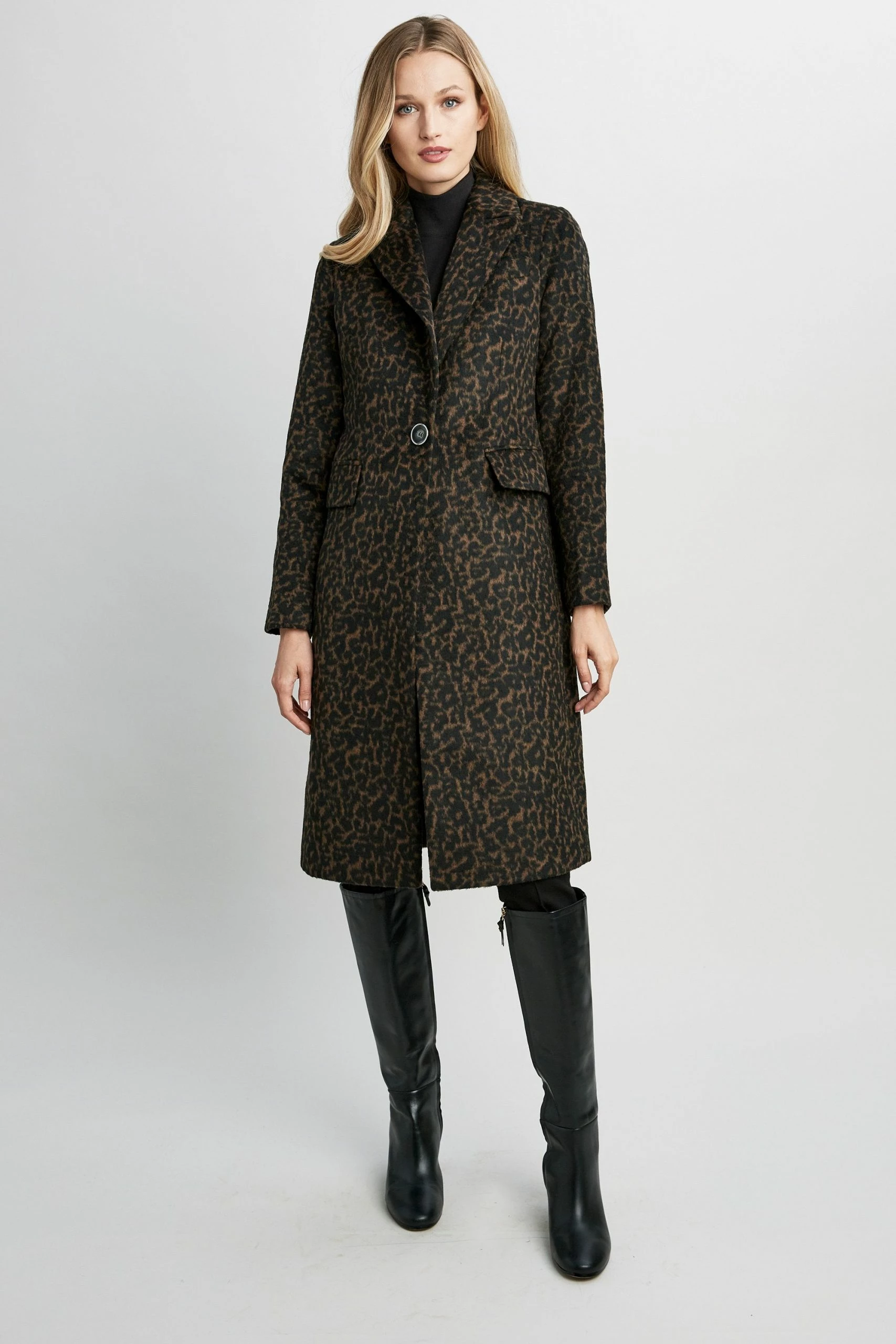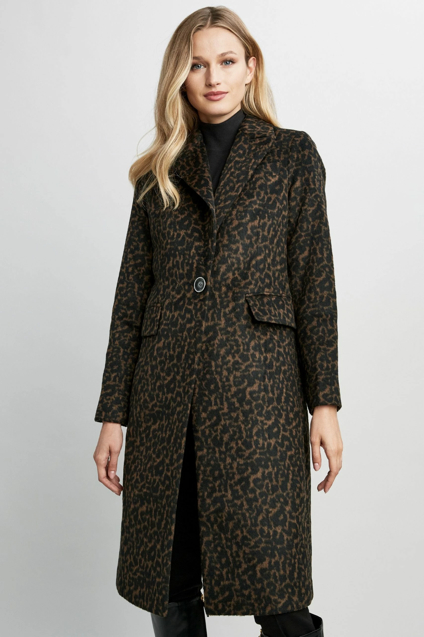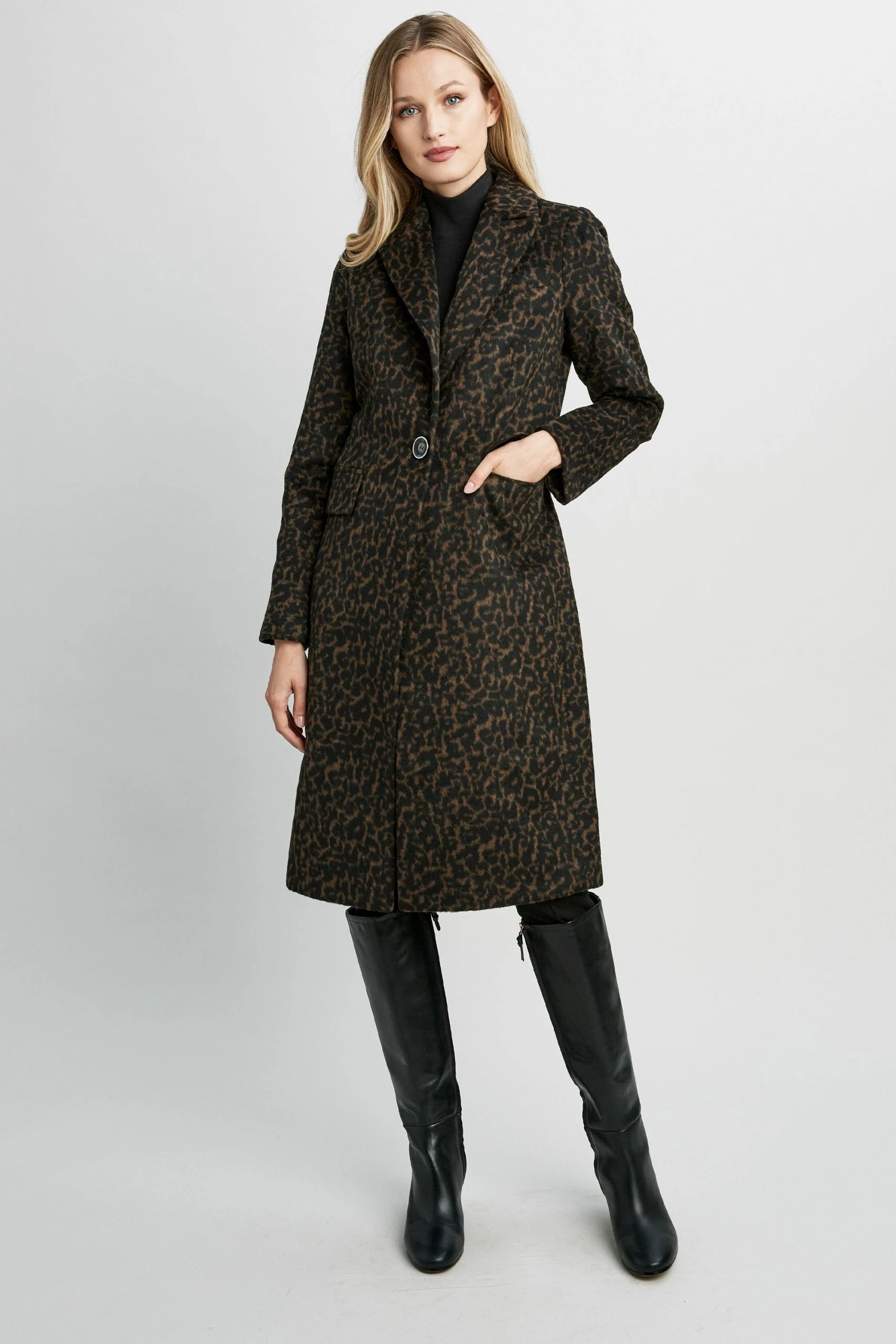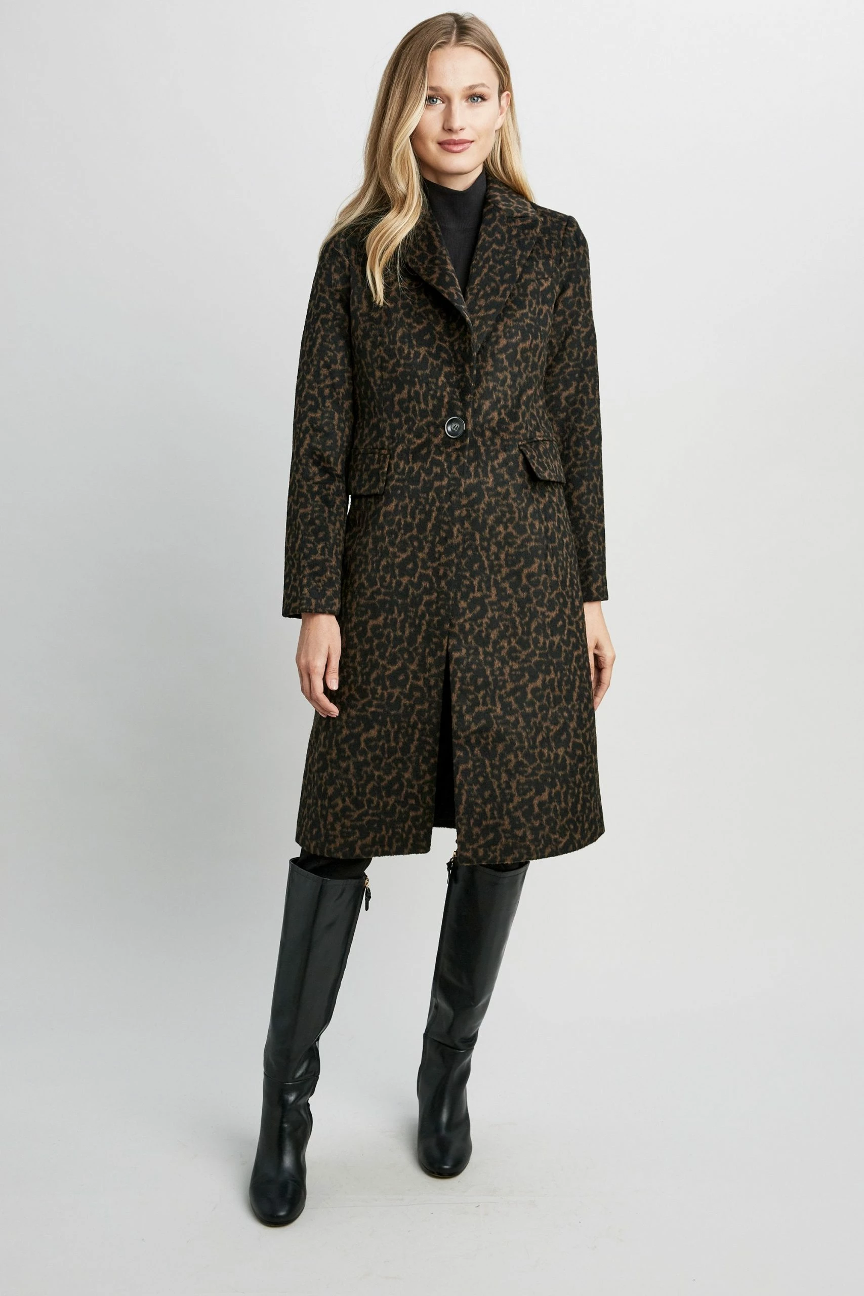 Designed in a subtle Leopard Jacquard Wool blend, this modern reefer coat tops off any cold weather look. Featuring a single button closure, notch lapel & side seam pockets, our Tahari Raven Coat blends sophistication, style and function.